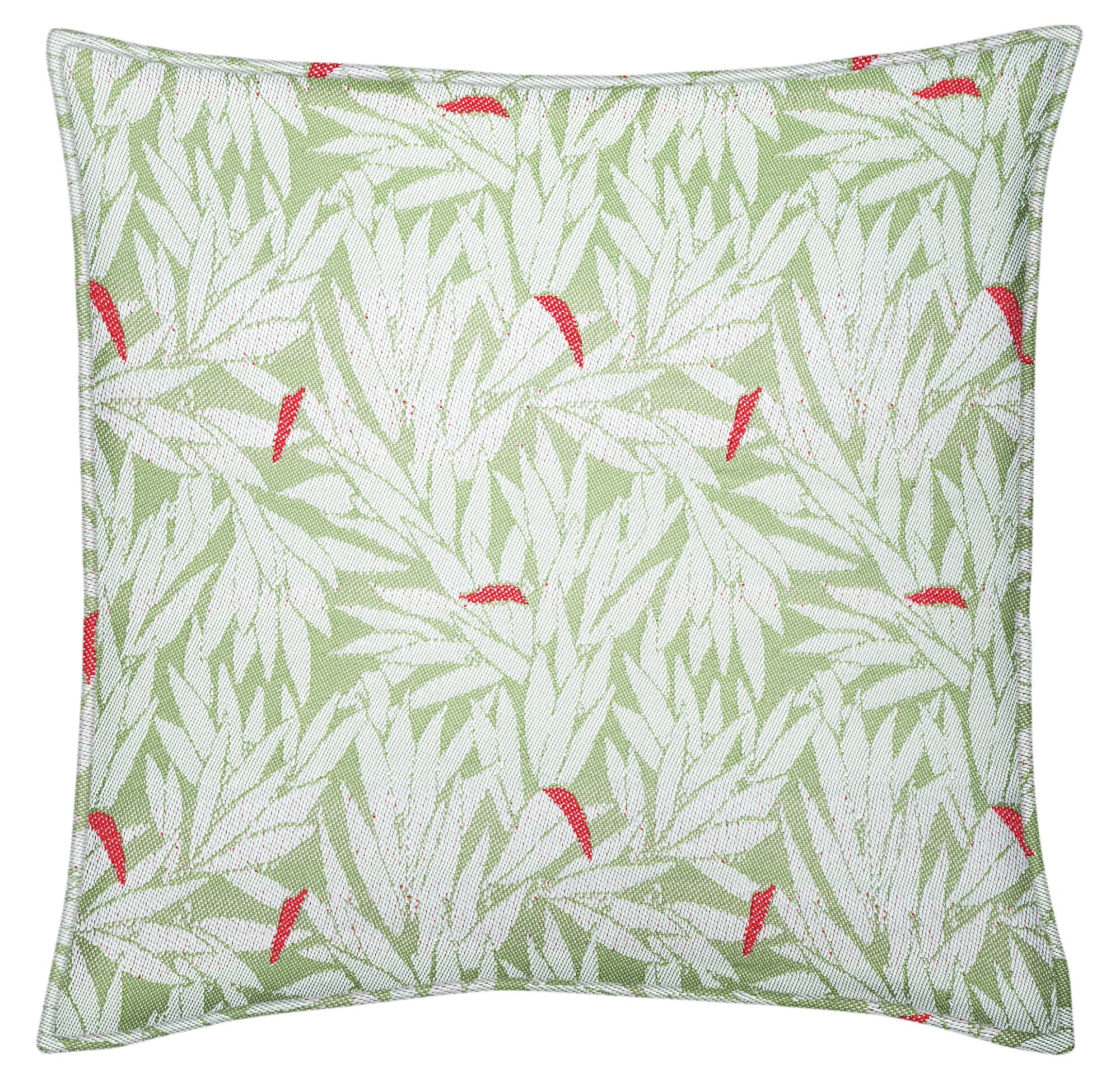 De kussenhoes is gemaakt van 100% recyclebaar polypropyleen. Deze custom geweven stof is energiezuinig geproduceerd zonder schadelijke coatings en heeft een zacht en luxe gevoel. Om deze reden is de kussenhoes dan ook zeer geschikt voor zowel binnen als buiten. De kussenhoes kan goed tegen zon en regen. Omdat de stof geen chemische coating heeft, neemt deze wel vocht op, maar droogt dan weer gemakkelijk, zonder verkleuring of nare geurtjes. Daarnaast behoudt het zijn kleur in de zon, is kreukvrij en vuilafstotend (cocktails, zonnebrand, noem maar op!).