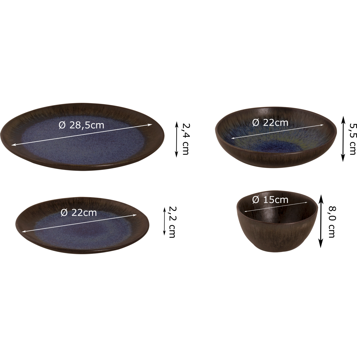 Het elegante blauw met zwart geven je ingedekte tafel een kalm karakter. Tama is perfect te combineren met diverse serviezen. De serie Tama van Palmer is gemaakt van stoneware en kan na gebruik gereinigd worden in de vaatwasmachine. Deze 24-delige serviesset is geschikt voor 6 personen en bestaat uit 6 dinerborden van 28,5 cm, 6 (ontbijt)borden met een doorsnede van 22 cm, 6 diepe (pasta)borden met een diameter van 22 cm en 6 schalen van 15 cm en met een inhoudsmaat van 80 cl.