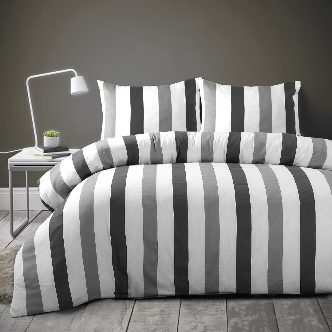 Voeg een tijdloze elegantie toe aan je slaapkamer met dit prachtige zwart-wit-grijze gestreepte katoensatijnen dekbedovertrek. De klassieke kleuren en het satijnen materiaal creëren een stijlvolle en luxueuze uitstraling.
