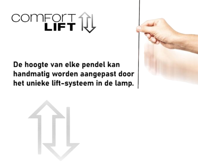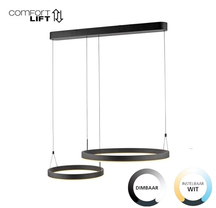 De Esko hanglamp is voorzien van een handige memoryfunctie, waardoor jouw laatst gekozen instellingen worden opgeslagen tot je zelf een verandering aanbrengt. Dit betekent dat je elke keer direct jouw gewenste lichtinstelling terugkrijgt. Daarnaast kunnen de twee ringen individueel in hoogte worden versteld dankzij de Comfort Lift. Dit innovatieve systeem maakt het aanpassen van de hoogte eenvoudig en betrouwbaar, zonder lastige tegengewichten in het plafond. Zo kun je de hoogte van de lamp snel en moeiteloos aanpassen aan de eettafel of andere ruimtes.