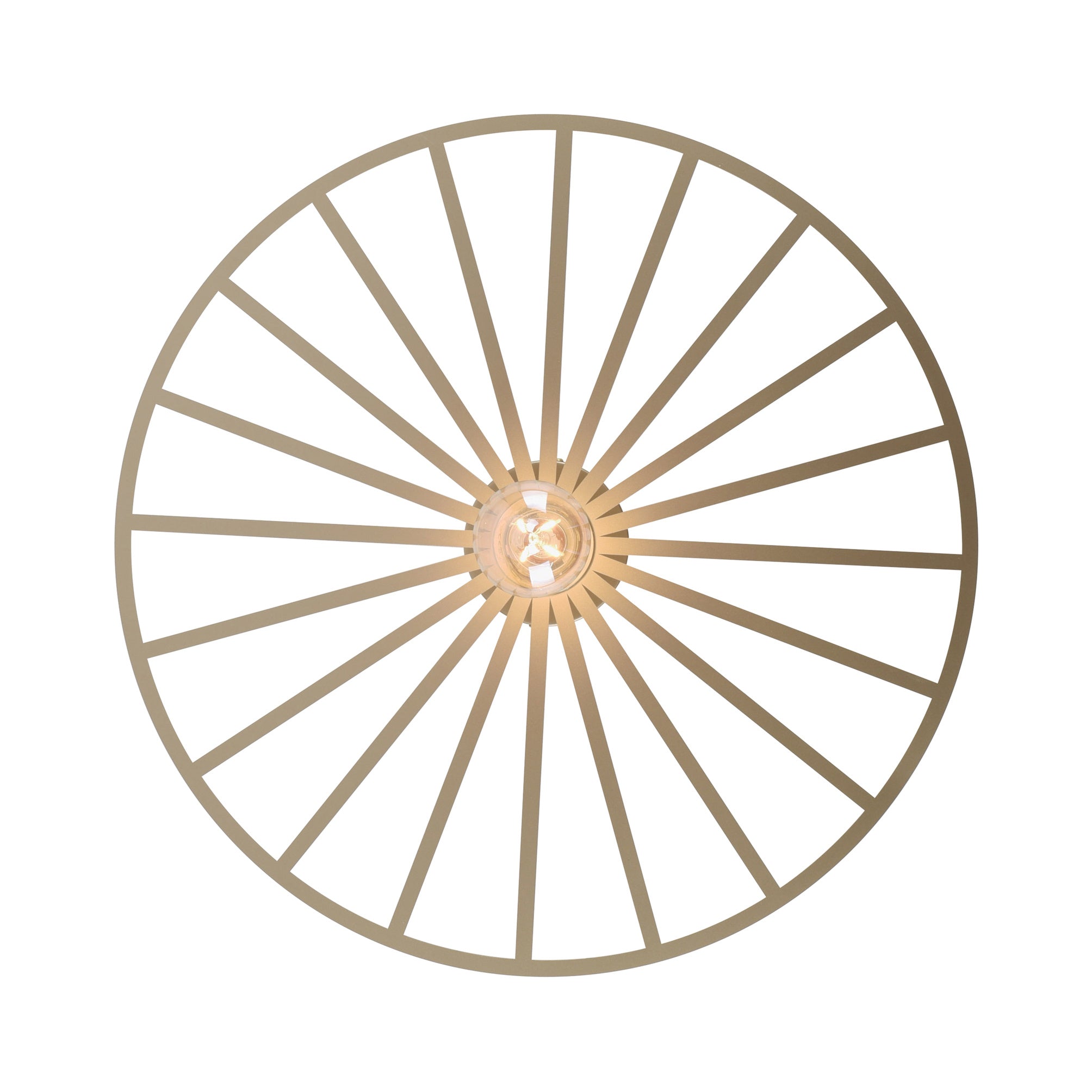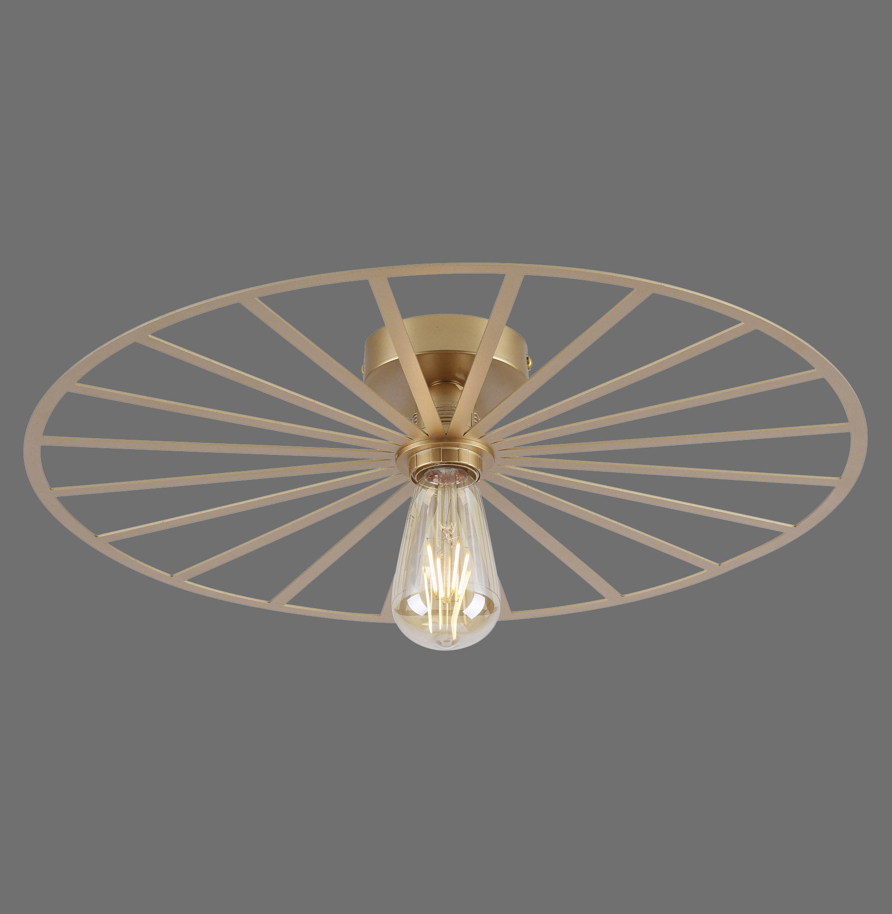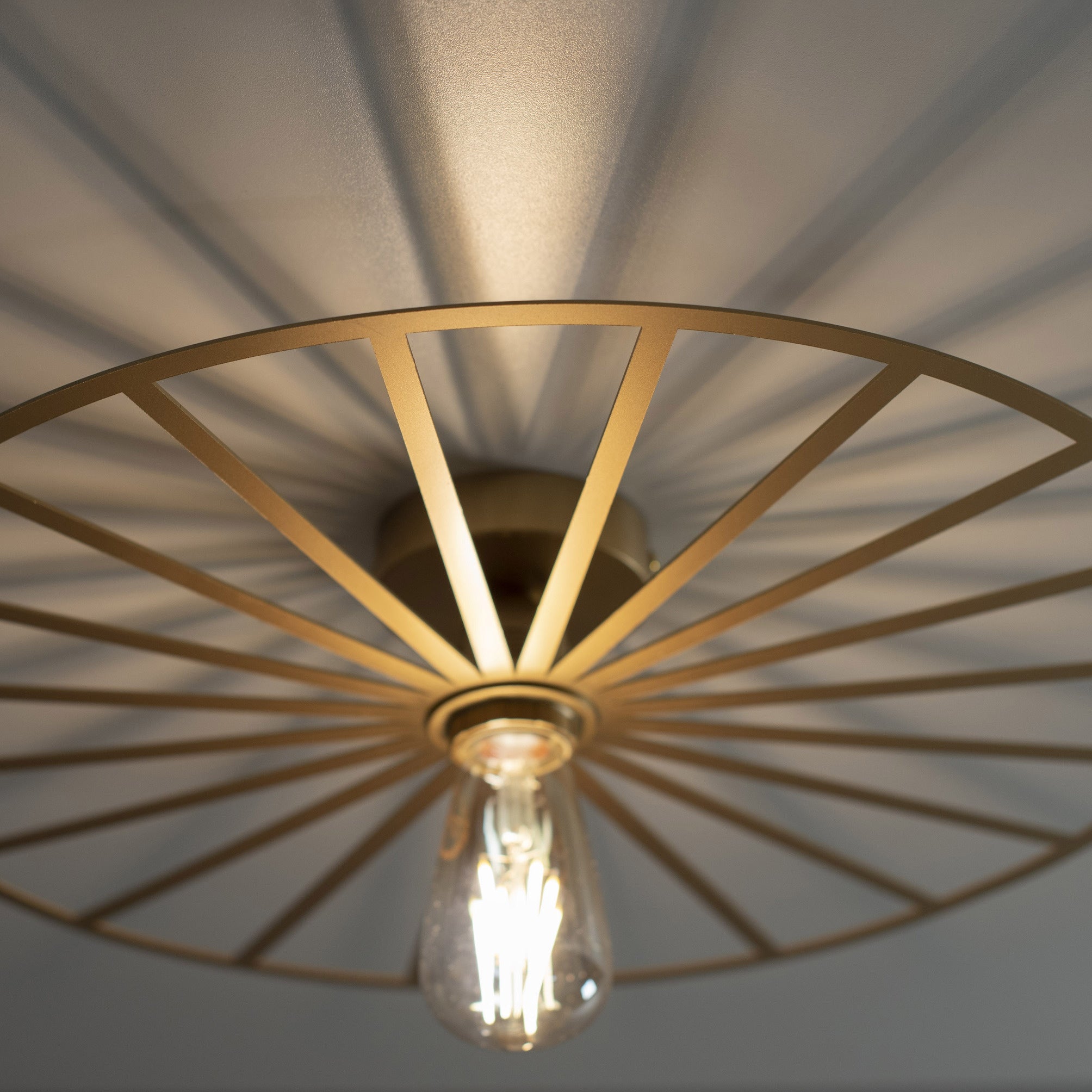 De doorsnede is 50 cm en de hoogte is 8,5 cm (zonder de lichtbron!). Deze plafondlamp is gemaakt van metaal en is mat-goud gespoten.