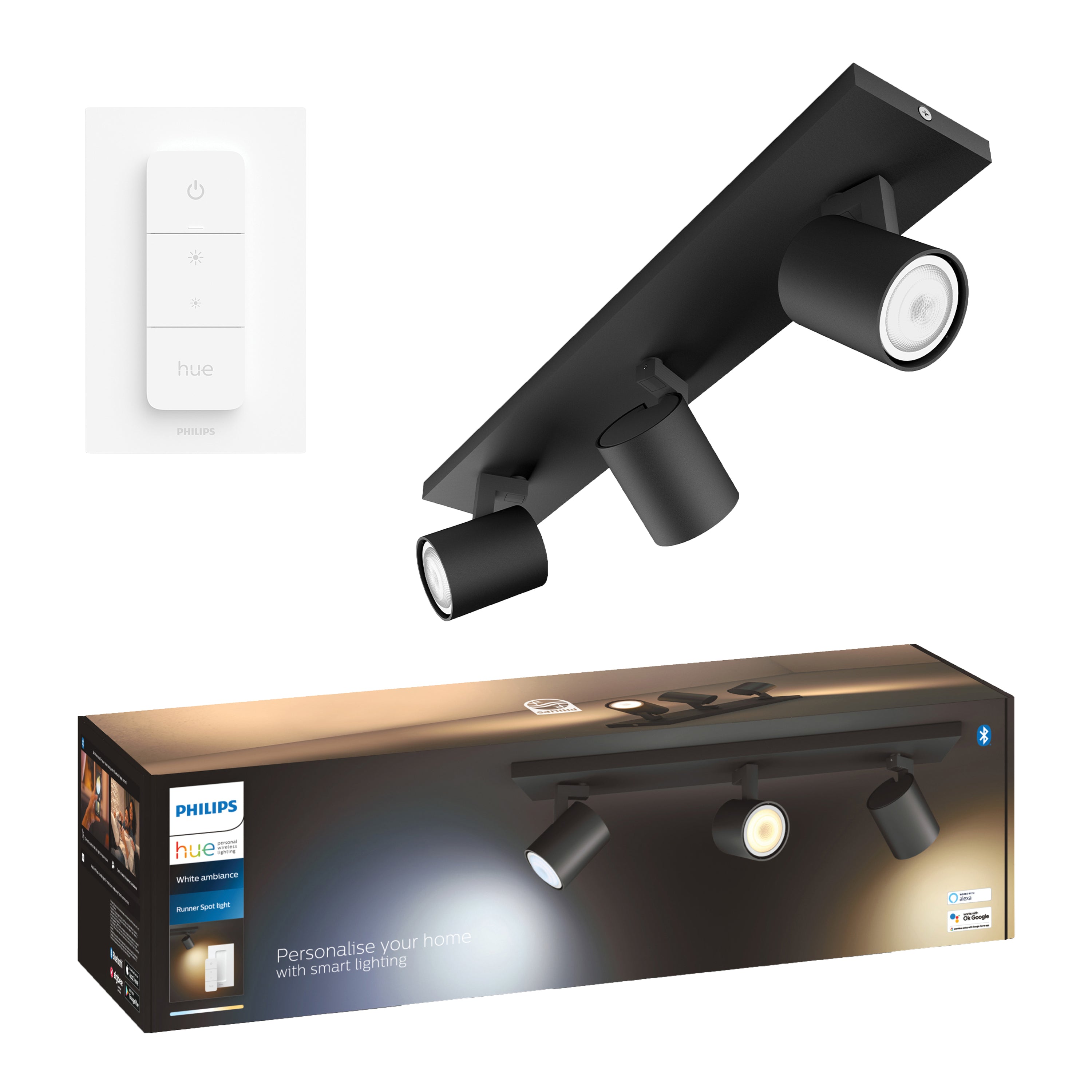 - De bediening is mogelijk via de bijbehorende app of de meegeleverde Hue dimmer switch