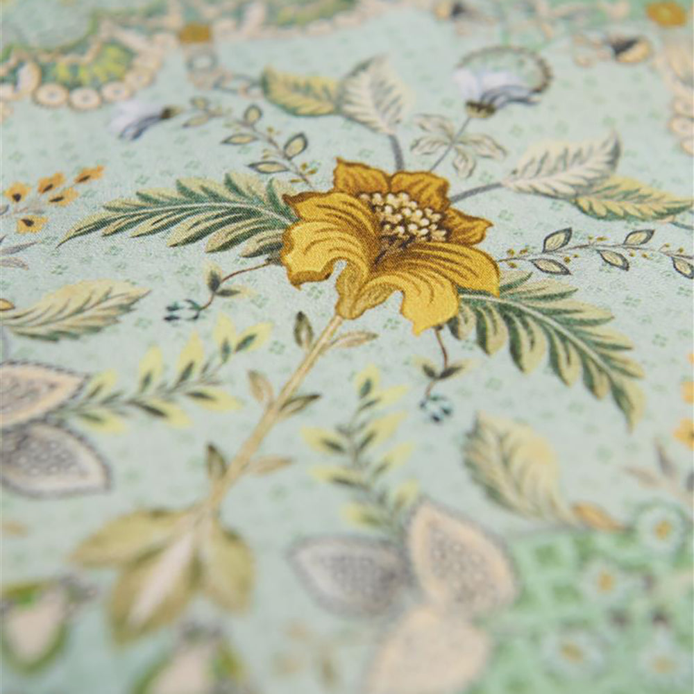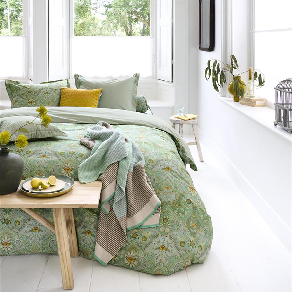 Waarom dekbedovertrek Saluti Piccoli? Het dekbedovertrek Saluti Piccoli is een symmetrisch opgebouwd bloemenpatroon, geïnspireerd op de prachtige behangmotieven uit Italië. De verfijnde bloemen zijn geschilderd in tonale kleuren met hier en daar een accentkleur. De achterkant heeft een patroon met groene en khaki horizontale streepjes. Het overtrek en de kussenslopen hebben een doorgestikte oxford rand aan de zijkanten en een gestreepte ronde bies, dit geeft een luxe uitstraling. De kussenslopen hebben een gestoffeerde knoopsluiting en net als het dekbedovertrek twee verschillende dessins en kun je tweezijdig gebruiken. Zo creëer je een speels mix & match effect. Het dekbedovertrek is niet alleen een blikvanger in je slaapkamer, door het gebruik van 100% katoenperkal is het overtrek heerlijk zacht en door de weefdichtheid van 200TC blijft de stof lang mooi. Het overtrek maak je eenvoudig op dankzij de extra lange instopstrook over de gehele breedte. Je kan het overtrek wassen tot 60 graden, strijken en is geschikt voor de wasdroger. Hoewel de hoogwaardige kwaliteit ervoor zorgt, dat strijken eigenlijk niet nodig is.