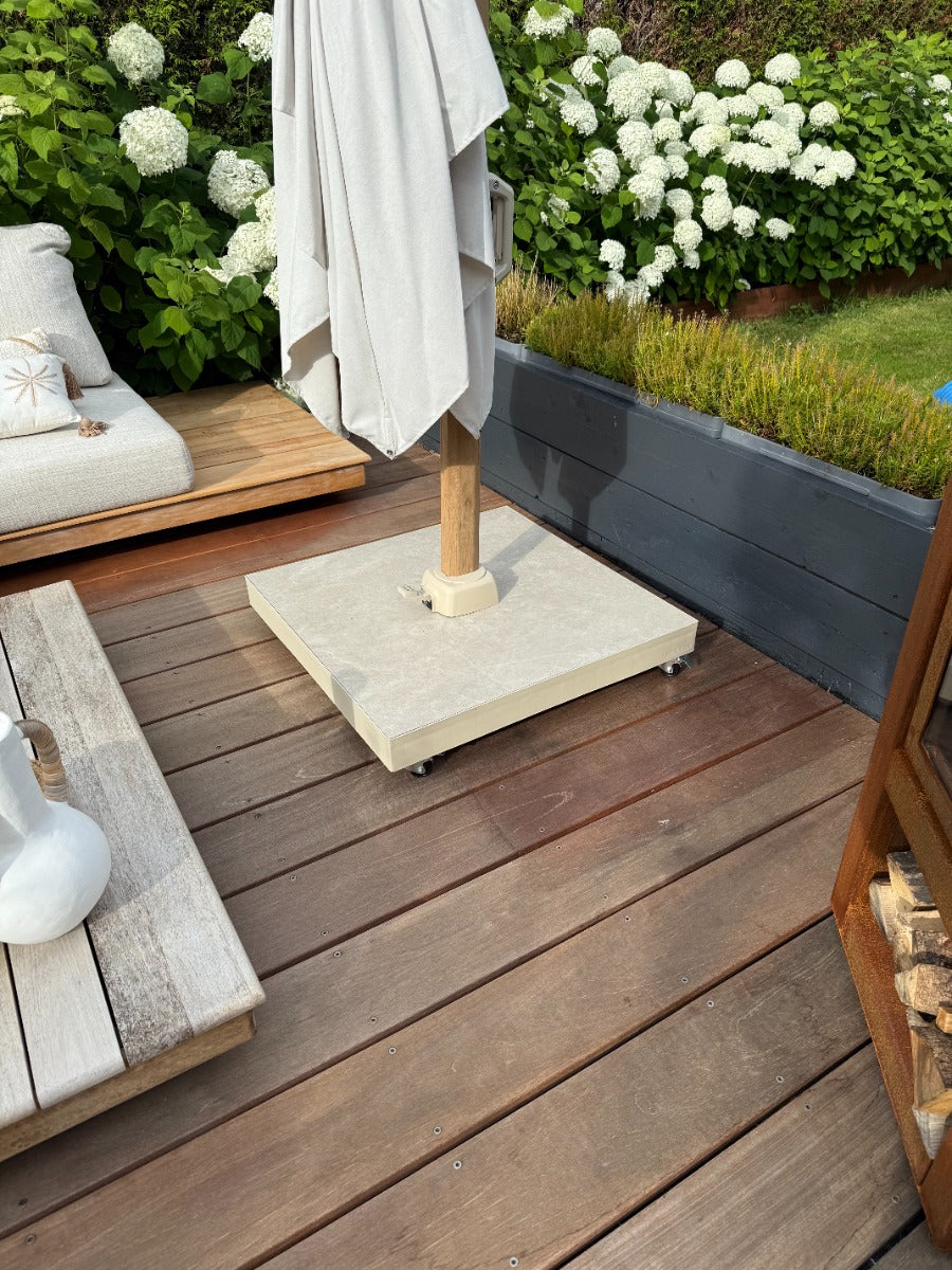 Deze vulbare parasolvoet Ceramica van Platinum is een goede keus voor zweefparasols die een maximale doorsnede hebben van 350 cm of 300x300 cm. Door de 4 wielen onder de voet, verplaats je deze heel gemakkelijk. De betonlook zorgt ervoor dat deze voet in de meeste tuinen past. Bestellen van deze parasolvoet kan direct online en wordt gratis bij jou thuisbezorgd. Niet zeker of dit de juiste parasolvoet is voor jou? Kom dan langs in onze showroom in Opheusden, Duiven of Apeldoorn. Je bent van harte welkom!