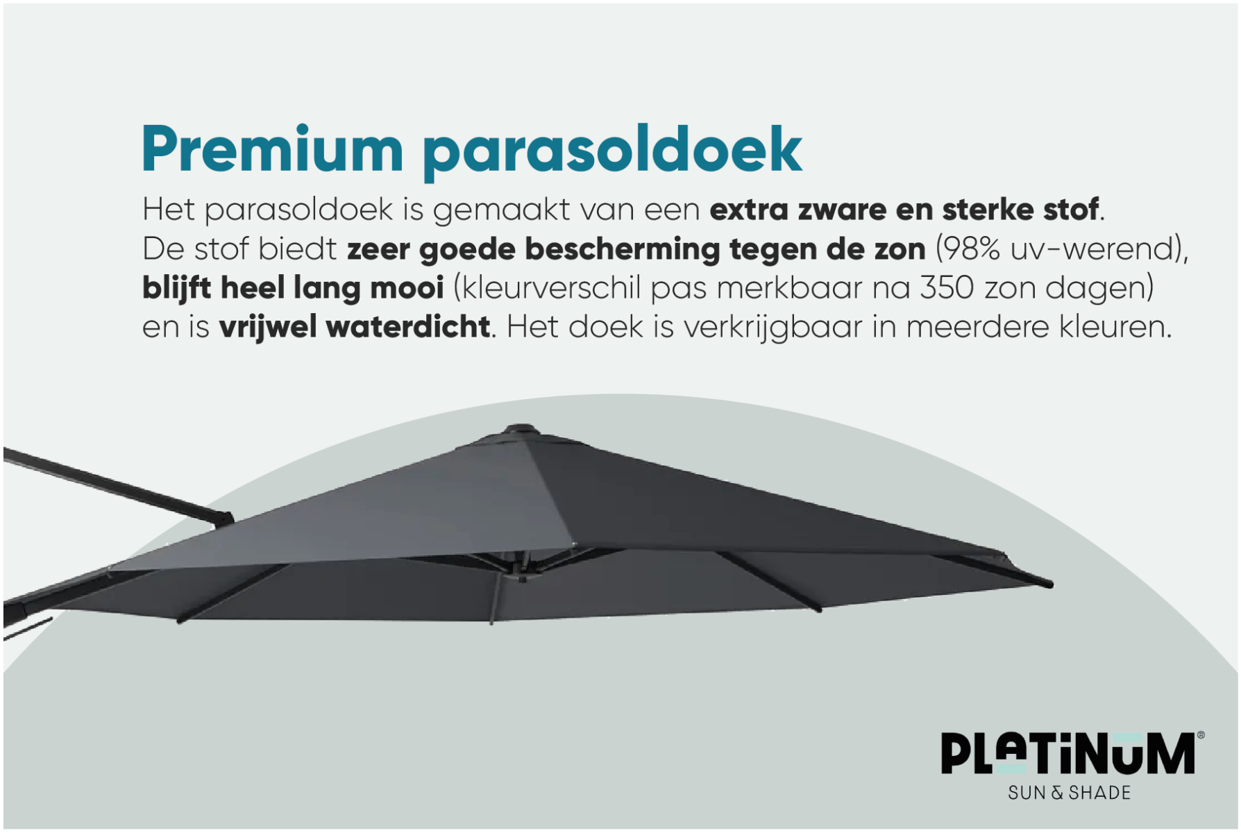 Functionaliteit, design, gebruiksgemak en robuustheid staan centraal bij alle producten van Platinum. Platinum levert parasols in allerlei soorten en maten: van compacte strandparasol tot royale zweefparasol. Dankzij de uitstekende kwaliteit materialen staan de producten van Platinum garant voor jarenlang gebruiksplezier!