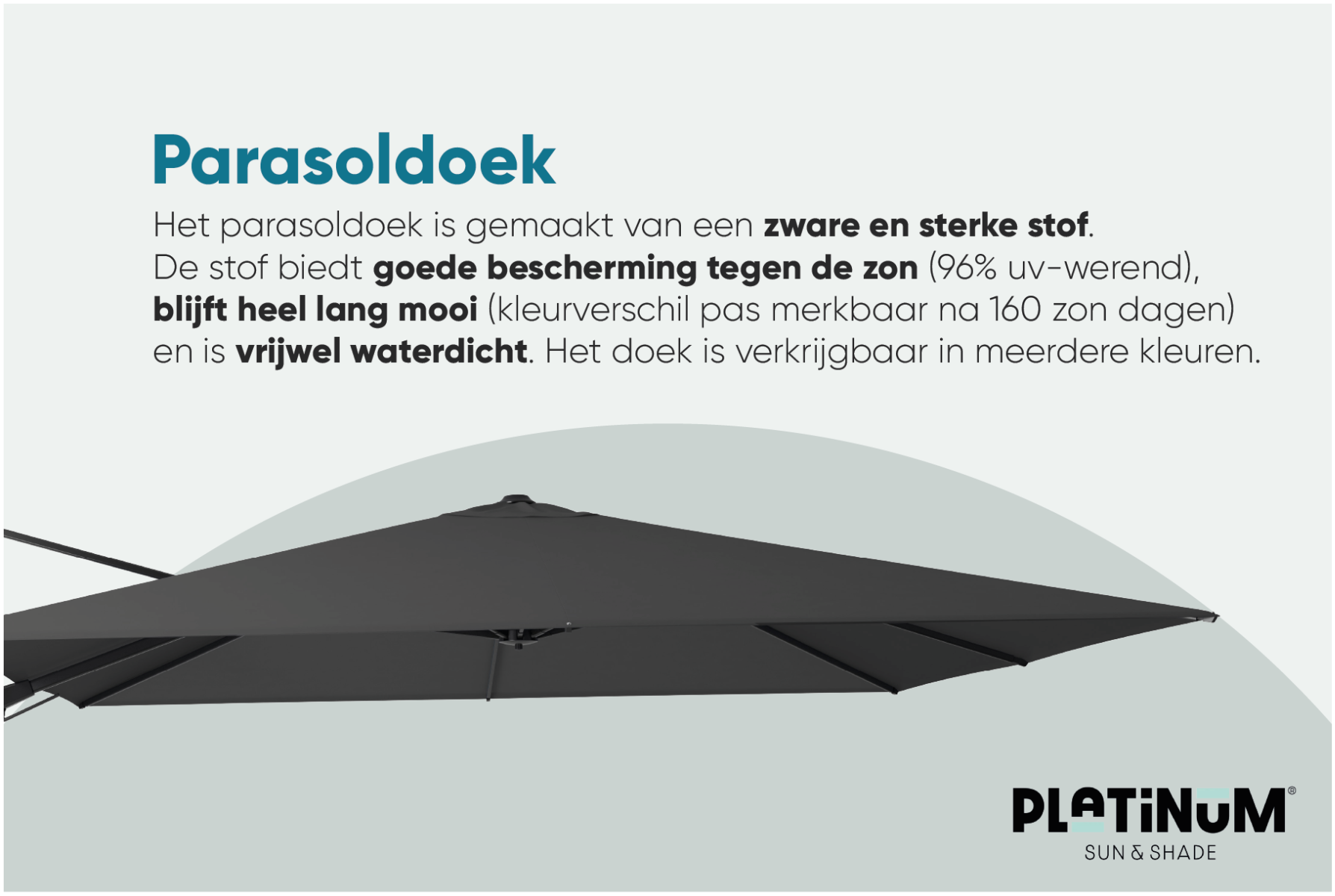 Op zoek naar een zweefparasol met bijpassende voet en hoes? Dan is de Platinum Challenger T2 3x3m. een aanrader. Deze grote zweefparasol wordt geleverd met een bijpassende parasolvoet van 90 kg. en een beschermhoes. De complete zweefparasol is eenvoudig online te bestellen en wordt gratis thuisbezorgd. De challenger heeft een antraciet frame en een Taupe parasoldoek. Het frame is gemaakt van aluminium. Dit materiaal is erg stevig en heeft als voordeel dat het niet kan verroesten. Het parasoldoek is gemaakt van polyester en is water en vuil afstotend.