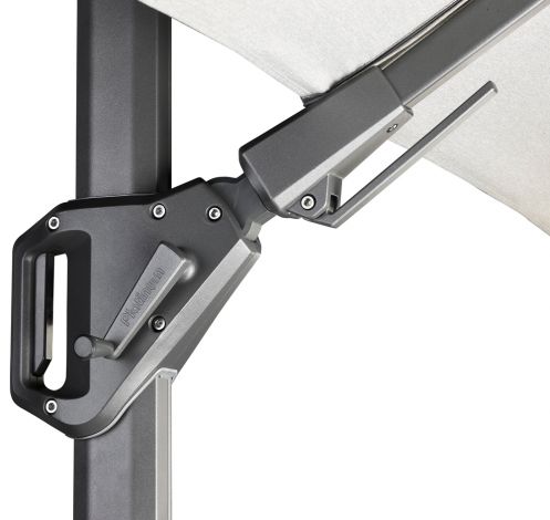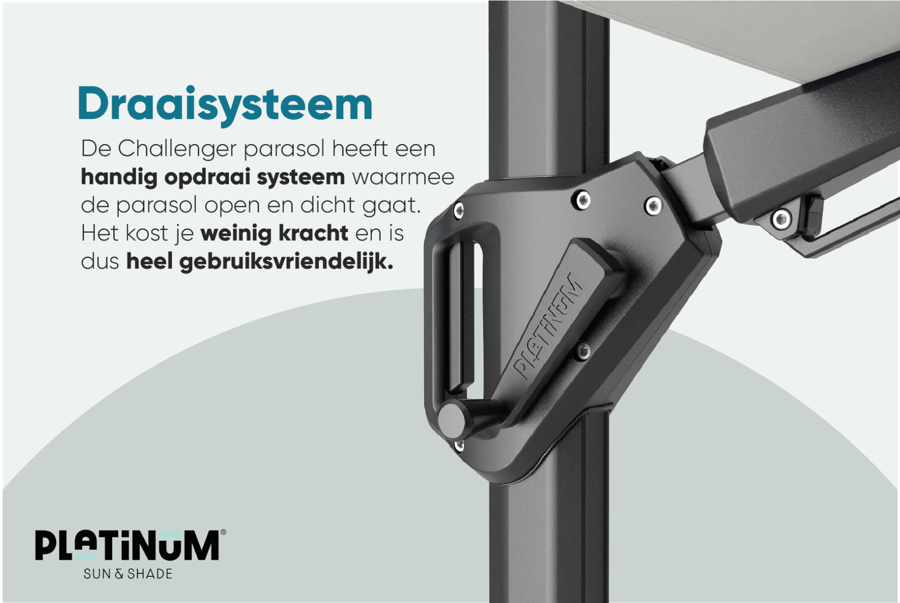 De Challenger T2 zweefparasol is voorzien van een voetpedaal waarmee deze 360 graden kan worden gedraaid. Zo kan je dus altijd in de schaduw zitten zonder de parasol te hoeven verplaatsen. Doormiddel van het speciale T2 systeem kan de parasol naar links en rechts worden gekanteld. Hierdoor kan je perfect inspelen op de stand van de zon. Daarnaast kan de parasol ook achterwaarts worden gekanteld wat erg handig is bij een laagstaande zon.