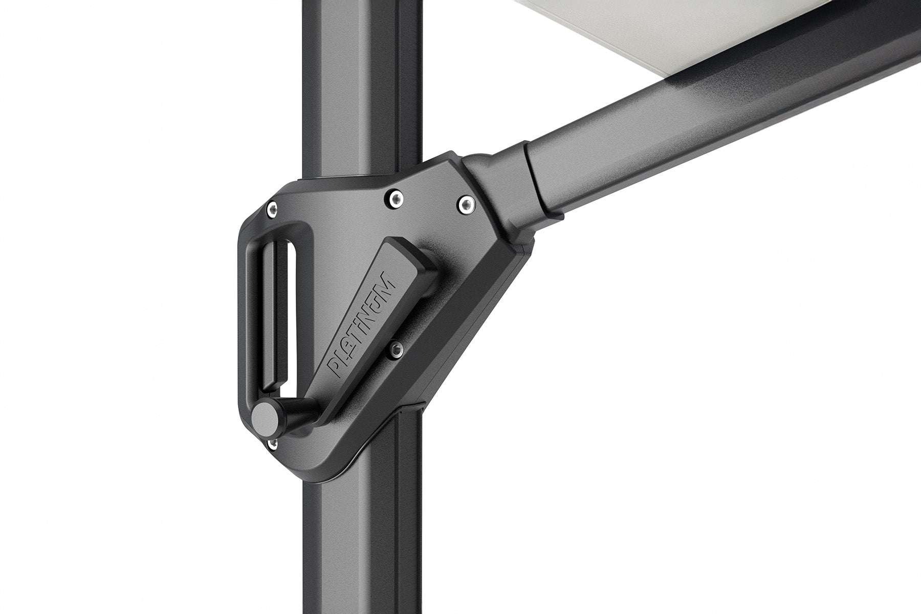 De Platinum Challenger Zweefparasol T1 Premium 4x3 m. in champagne biedt stijlvolle schaduw. Het luxe champagnekleurige doek beschermt tegen de zon, terwijl de stevige constructie en draaimechanisme zorgen voor optimale schaduw zonder gedoe!