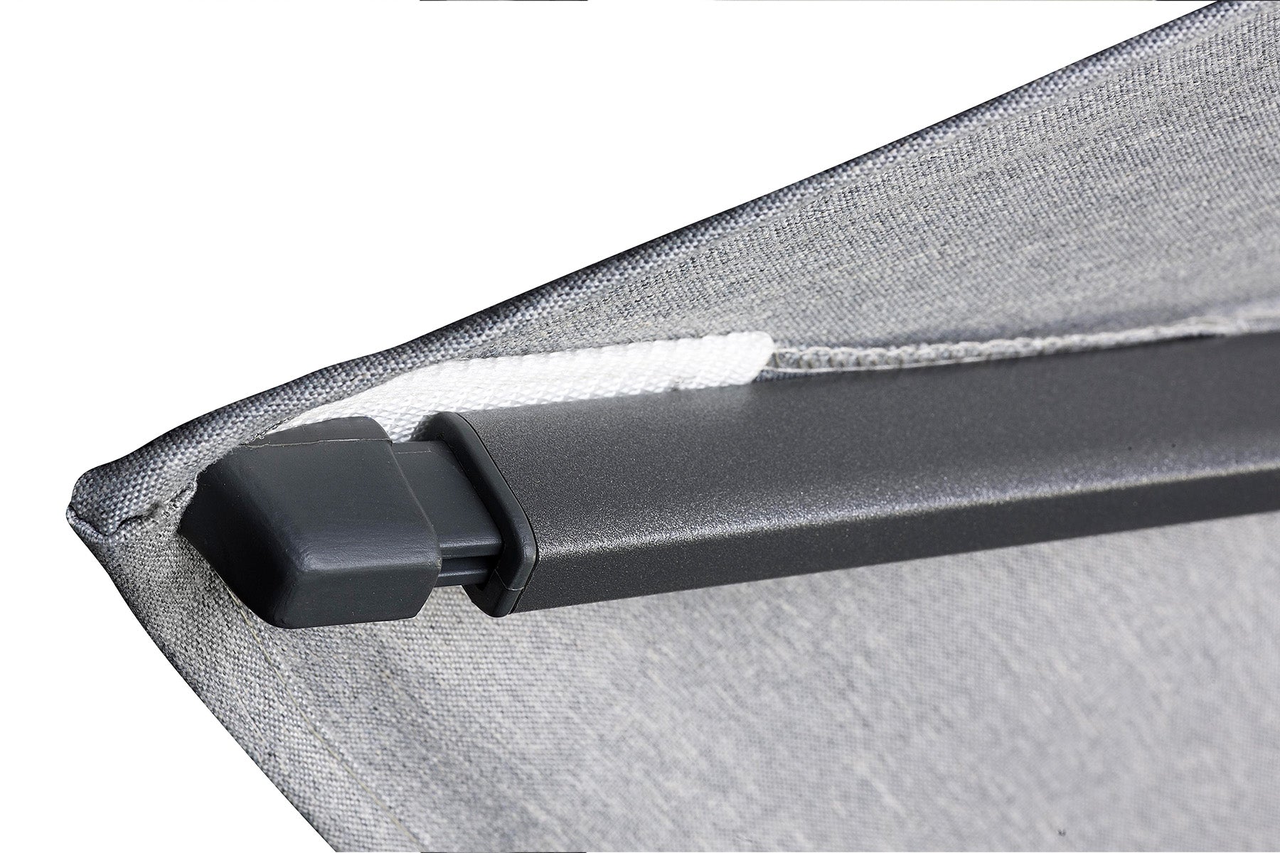 Het frame van de parasol is gemaakt van duurzaam aluminium en afgewerkt met een antraciet coating. Aluminium is sterk en roest niet, waardoor de parasol lang meegaat. De aluminium baleinen zijn voorzien van doekspanners, die het doek strak gespannen houden en bijdragen aan een luxe uitstraling.