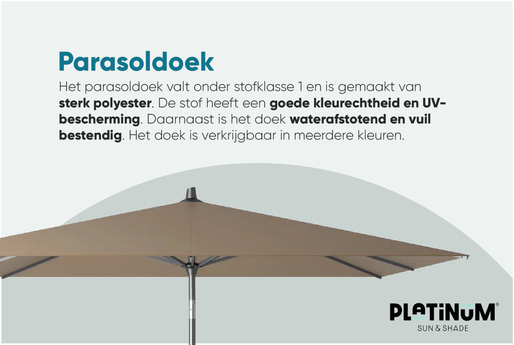 Geniet van voldoende schaduw met deze handige stokparasol van Platinum. Het doek is voorzien van een speciale vuil- en waterafstotende coating!