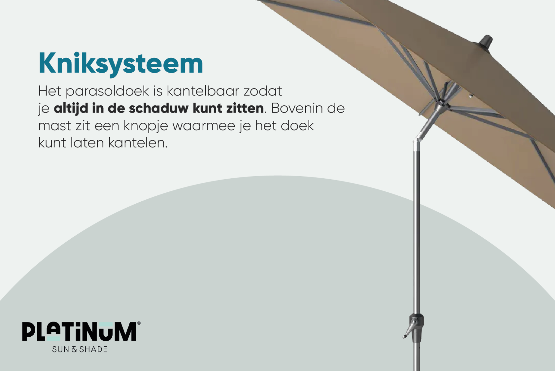 De Riva parasol is voorzien van een handig kniksysteem. Hiermee kan je goed inspelen op de stand van de zon. Je kantelt het parasoldoek daarmee namelijk eenvoudig schuin in de baan van de zon. De parasol vangt in de schuine stand wel meer wind. Wij adviseren dan ook om daar goed op te letten.