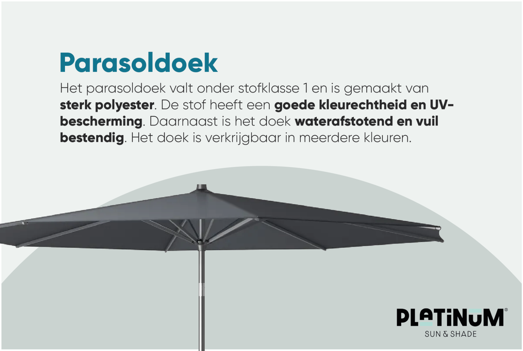 Functionaliteit, design, gebruiksgemak en robuustheid staan centraal bij alle producten van Platinum. Platinum levert parasols in allerlei soorten en maten: van compacte strandparasol tot royale zweefparasol. Dankzij de uitstekende kwaliteit materialen staan de producten van Platinum garant voor jarenlang gebruiksplezier!