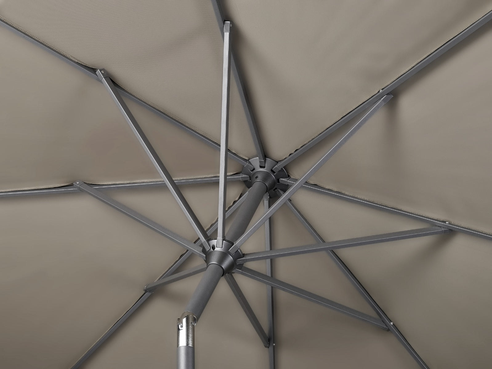 Het parasoldoek is uitgevoerd in een stijlvolle antracietkleur. Bij de productafbeeldingen kun je een kleurstaal vinden ter referentie. Het doek is vervaardigd uit 100% polyester van hoogwaardige kwaliteit en is behandeld met een speciale coating die vuil en water afstoot. Deze beschermlaag helpt ook om verkleuring van het doek tegen te gaan, waardoor de parasol er langer als nieuw uit blijft zien. Aan het uiteinde van de baleinen bevindt zich een doekspanner, die ervoor zorgt dat het doek altijd strak gespannen staat.