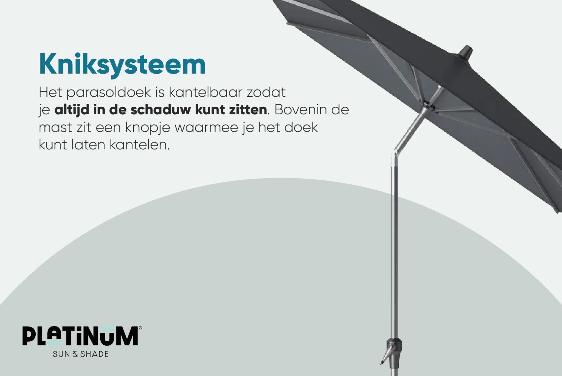 De Riva parasol beschikt over een praktisch kniksysteem waarmee je het doek schuin kunt kantelen. Dit is ideaal om de stand van het doek aan te passen aan de positie van de zon. Houd er wel rekening mee dat de parasol in gekantelde stand meer wind vangt. We adviseren dan ook om hier extra alert op te zijn.