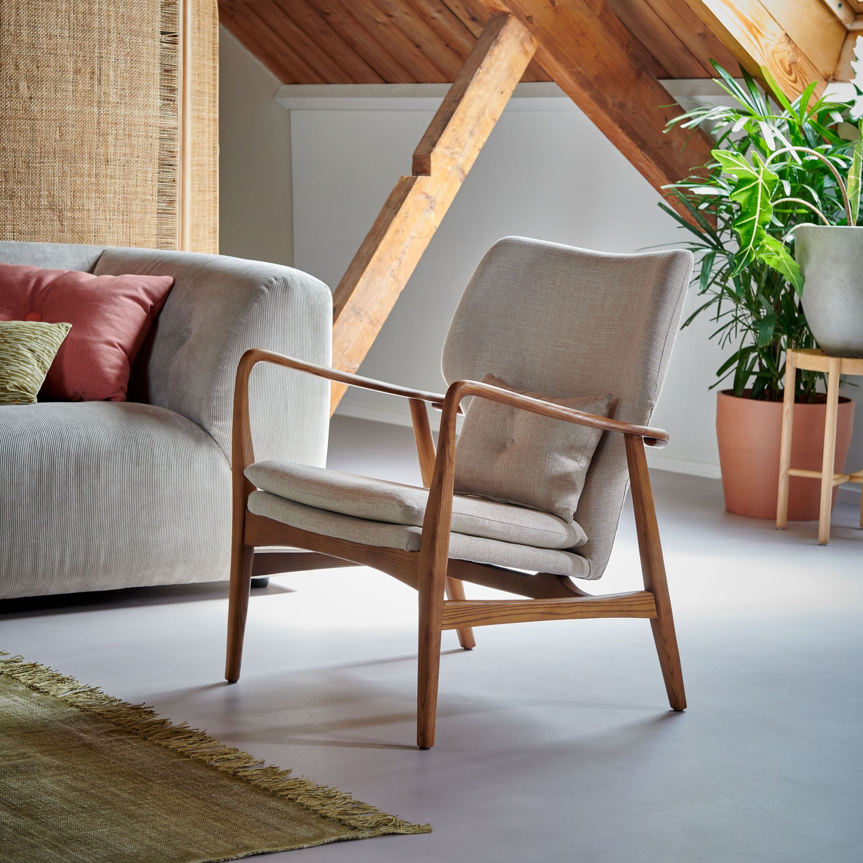 - De combi van hout en textiel geeft de stoel een retro tintje