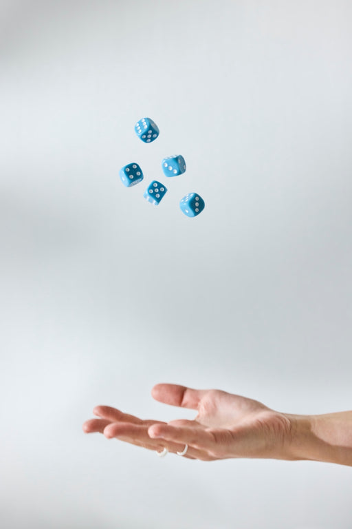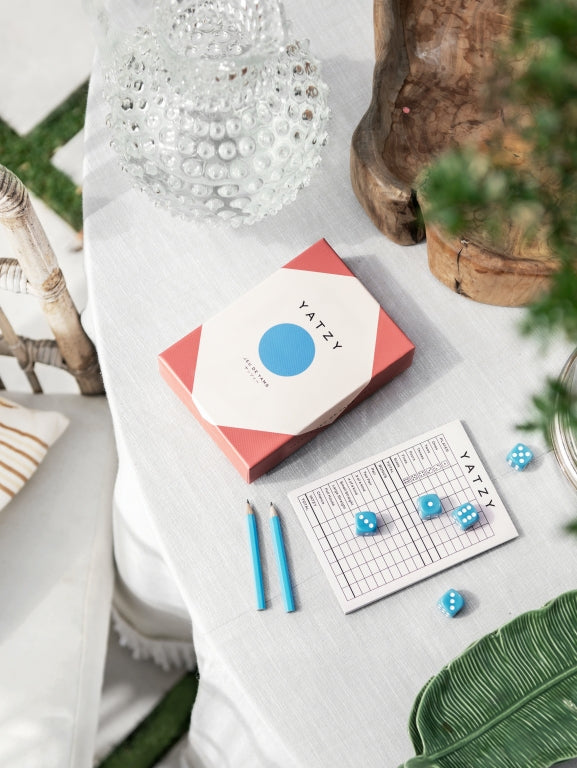 - In het doosje vind je 5 blauwe dobbelstenen, twee potloden en scorekaarten.
