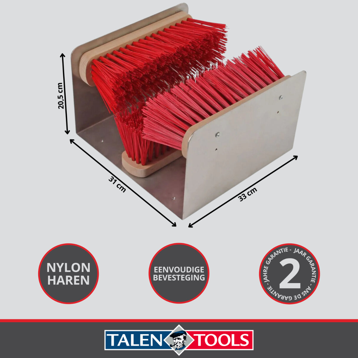 Je schoenen afborstelen? Gebruik deze handige professionele voetenveger, waarbij je meerdere kanten van de schoen of laars schoonborstelt. Door het kwalitatief sterke materiaal is deze voetenveger onmisbaar bij boerderijen, bouwplaatsen, sportparken en maneges. De schoenenborstel met drie borstels is vast te zetten aan de grond of mobiel bruikbaar. Het formaat van deze borstel: 30 x 28 x 14 centimeter. Nylon borstels De borstels bestaan uit nylon. Het voordeel hiervan is dat de haren niet in elkaar verstrikt raken, ook niet wanneer je vochtige schoenen afborstelt. Bovendien is nylon ook zeer slijtvast, waardoor de borstels nog jarenlang sterk en functioneel blijven. Schoenenvegers onderhouden Door het weerbestendige materiaal zijn de borstels zelf ook eenvoudig te onderhouden. Zitten ze onder het vuil dat van de schoenen is afgekomen? Gebruik dan zo nu en dan een tuinslang of hogedrukreiniger om de borstel weer schoon te krijgen Voordelen van de professionele schoenenveger