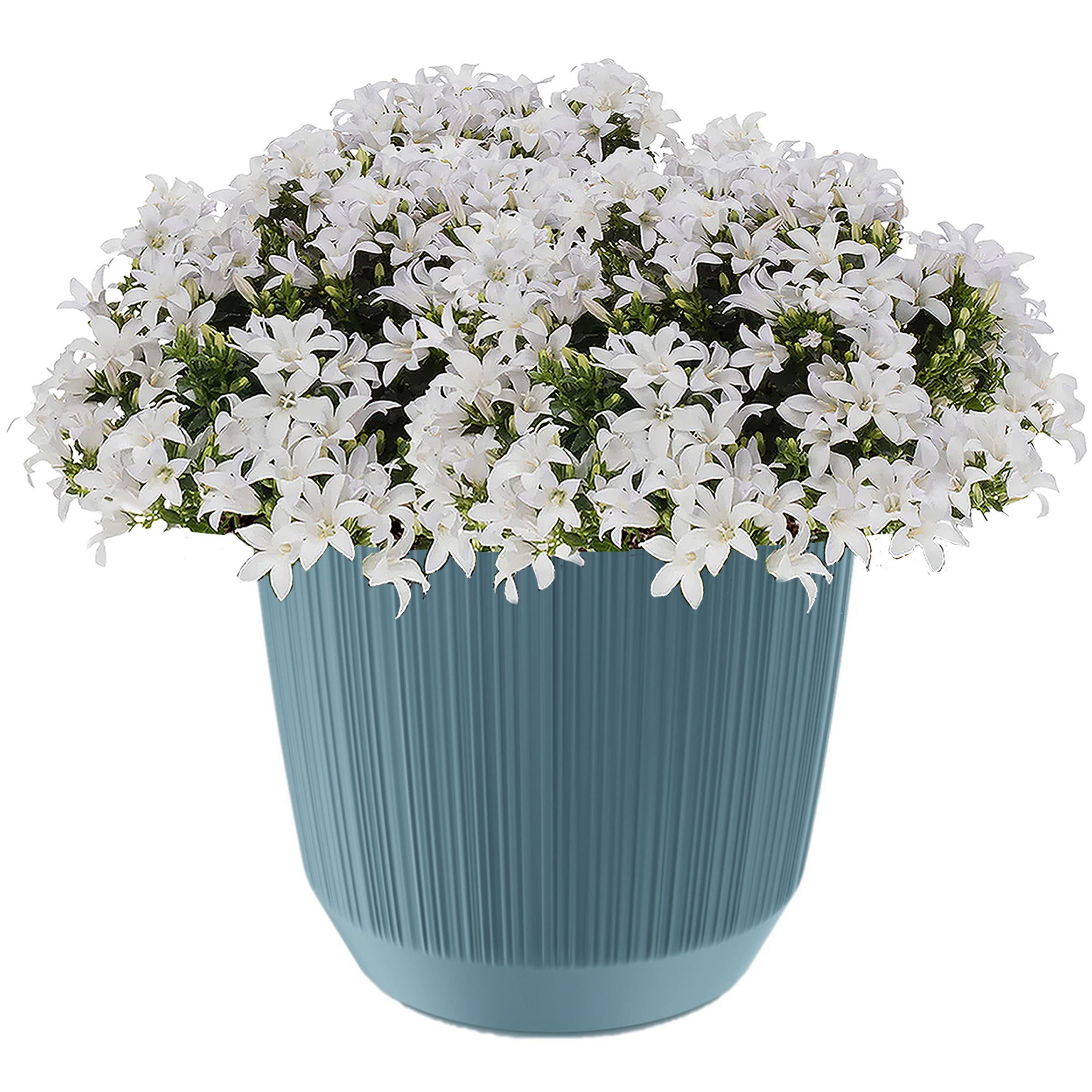Prosperplast Plantenpot, ijsblauw. Moderne carf-stripe plantenpot/bloempot van kunststof met diameter 13 cm en hoogte 11 cm in het ijsblauw. Geschikt voor buiten en binnen. Vorstbestendig ja. Basic plantenpotten voor in de tuin, balkon of binnen.
