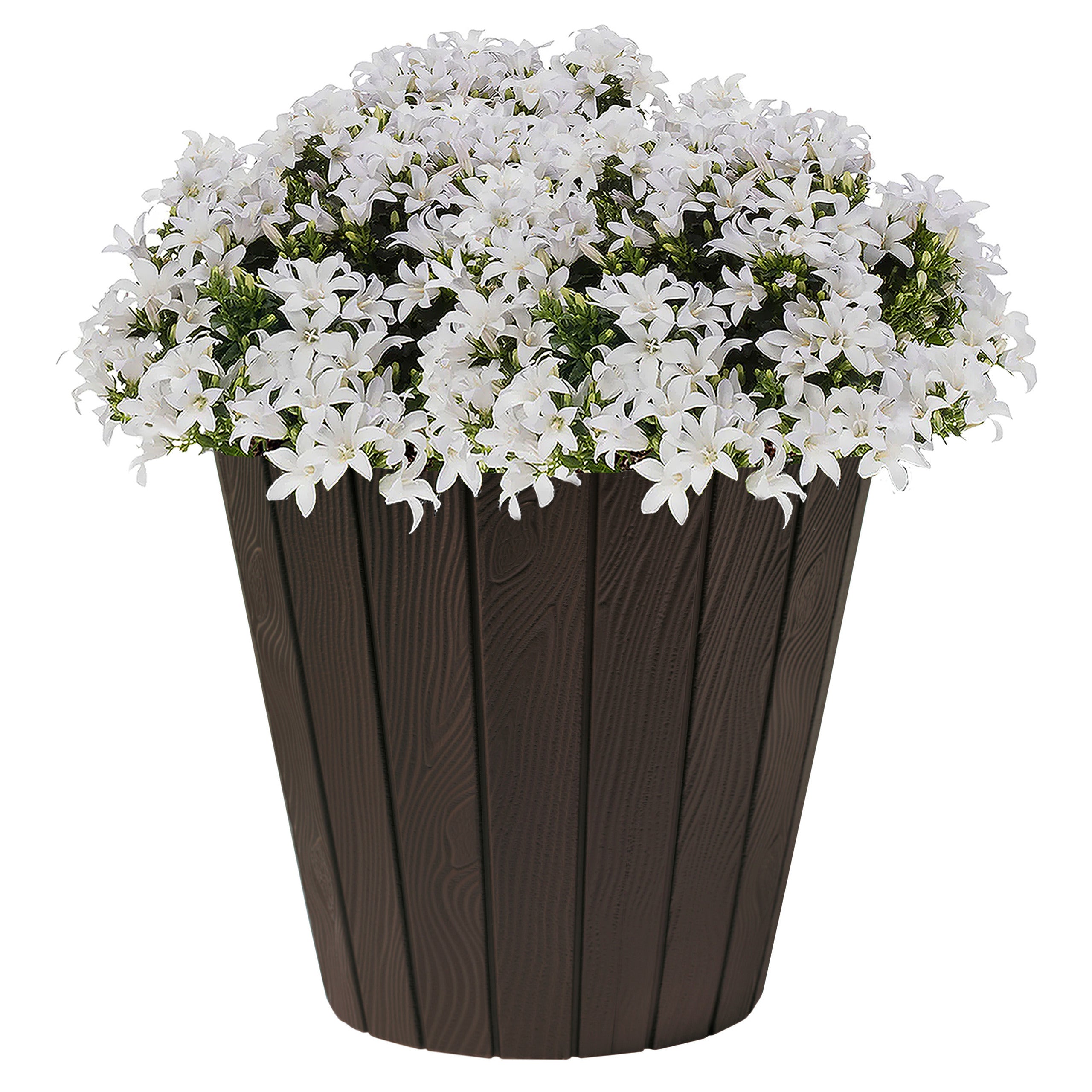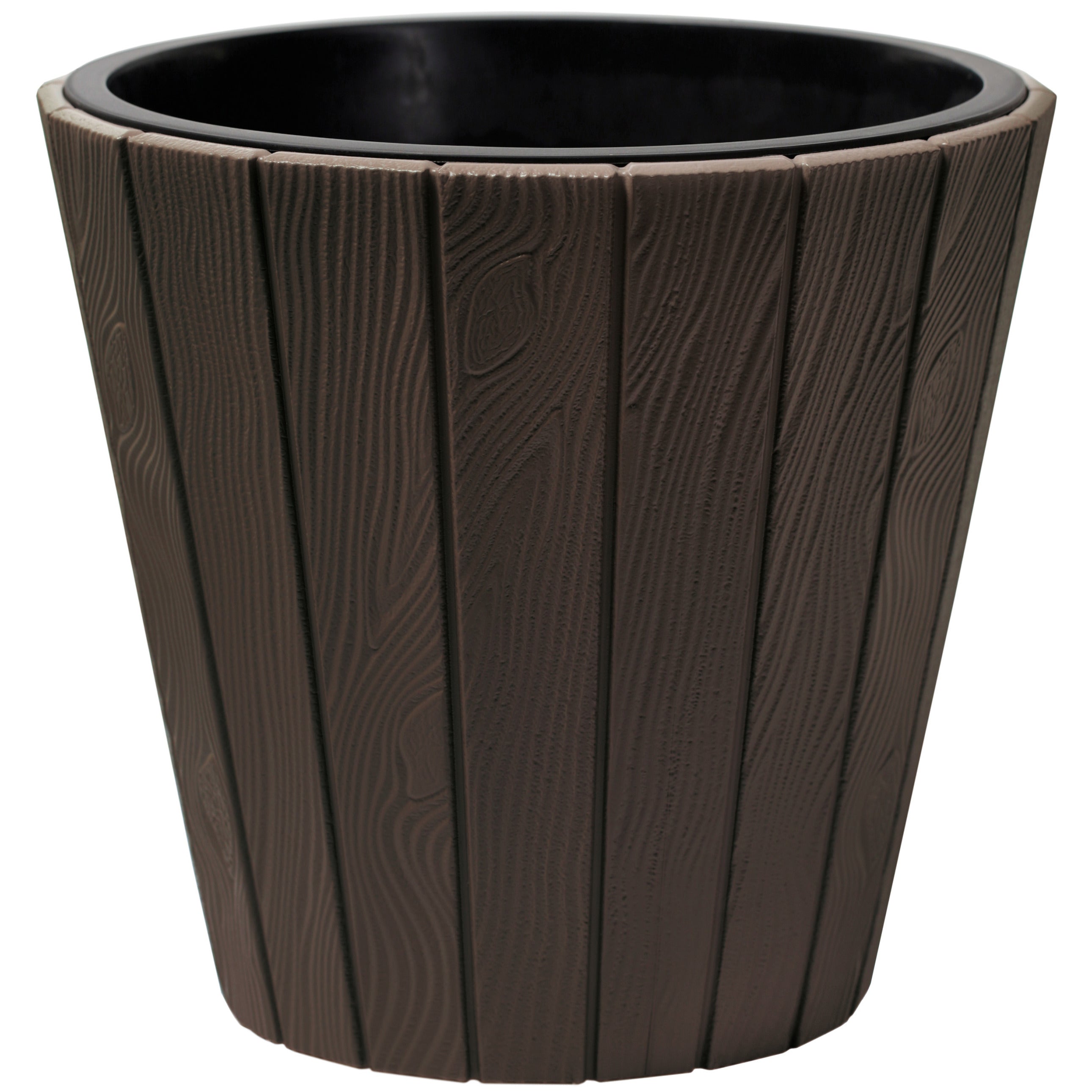 Plantenpot/bloempot uit de Wood Style collectie is gemaakt van PP kunststof in de kleur donkerbruin met een houten planken patroon aan de buitenzijde. Deze prachtige ronde bloempot is echt een schitterende toevoeging aan uw tuin/terras/huis. De bloempot is voor buiten en binnen gebruik geschikt en heeft een losse binnenpot met hendels. De kunststof constructie van de plantenpot maakt dat de pot licht van gewicht is, waardoor hij makkelijk is te verplaatsten. Formaat: Diameter 40 cm x Hoogte 37 cm. UV en vorst bestendig.