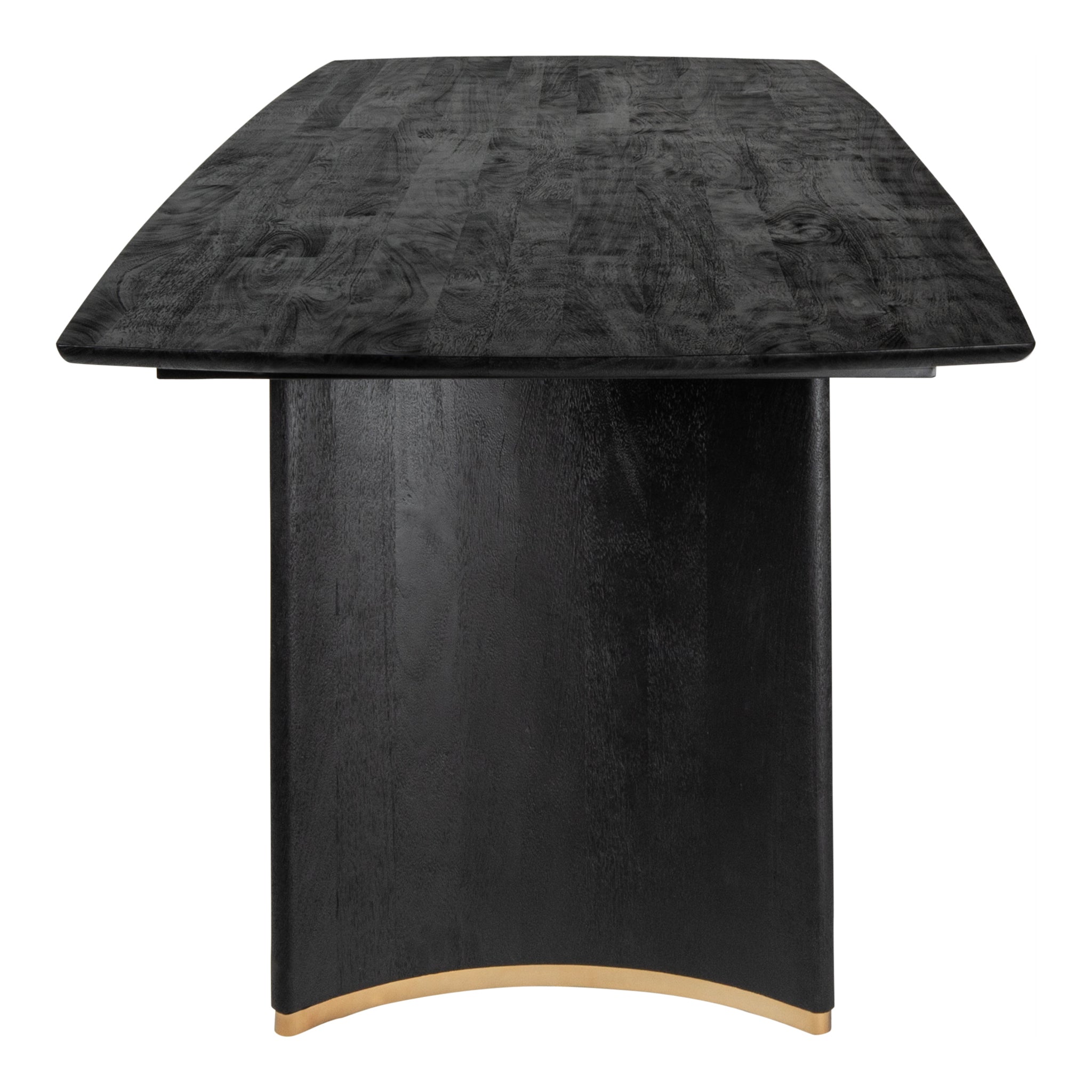 Elegant design: Het tafelblad van mangohout in diep zwart wordt ondersteund door een slank gouden onderstel, wat zorgt voor een tijdloze en elegante uitstraling in je eetkamer.