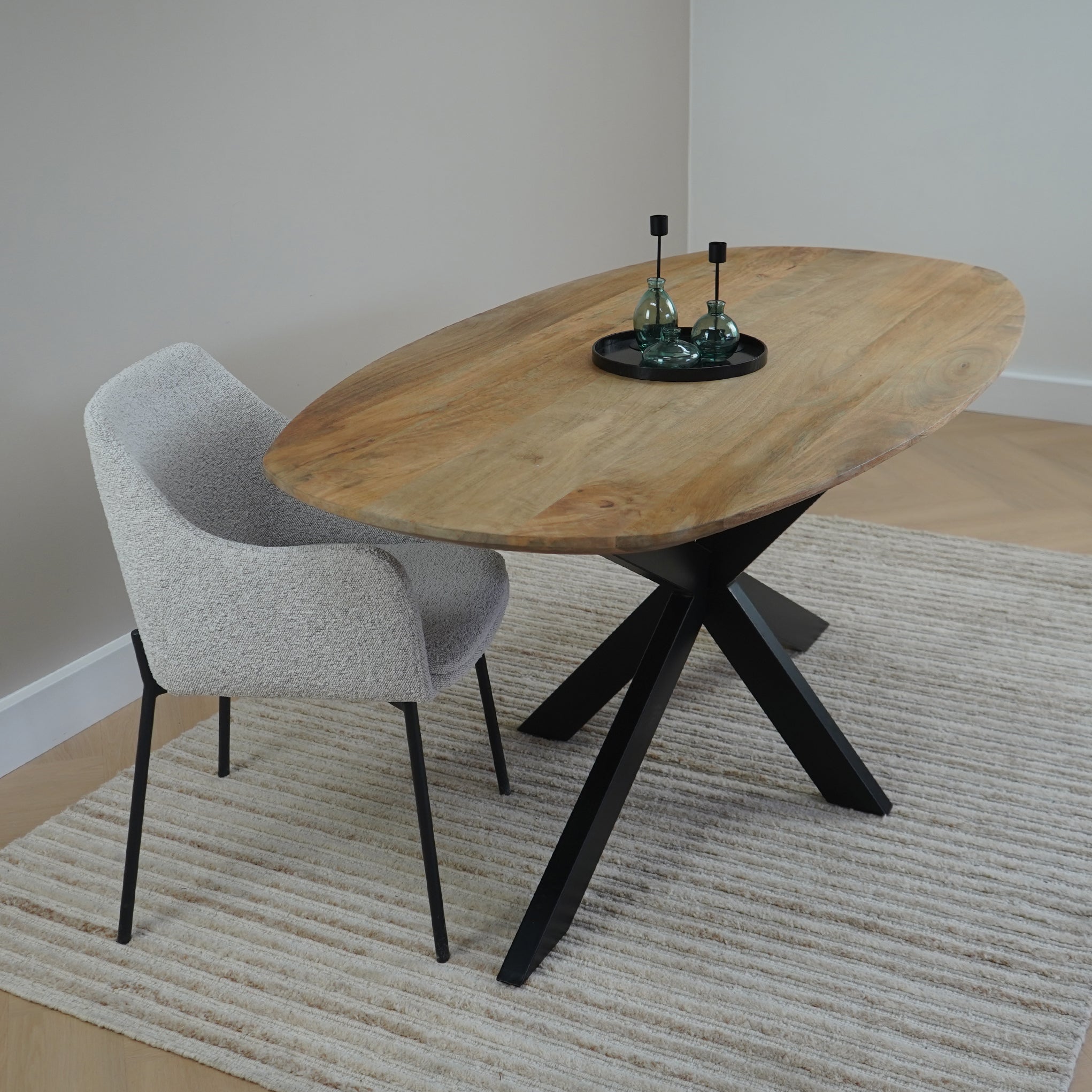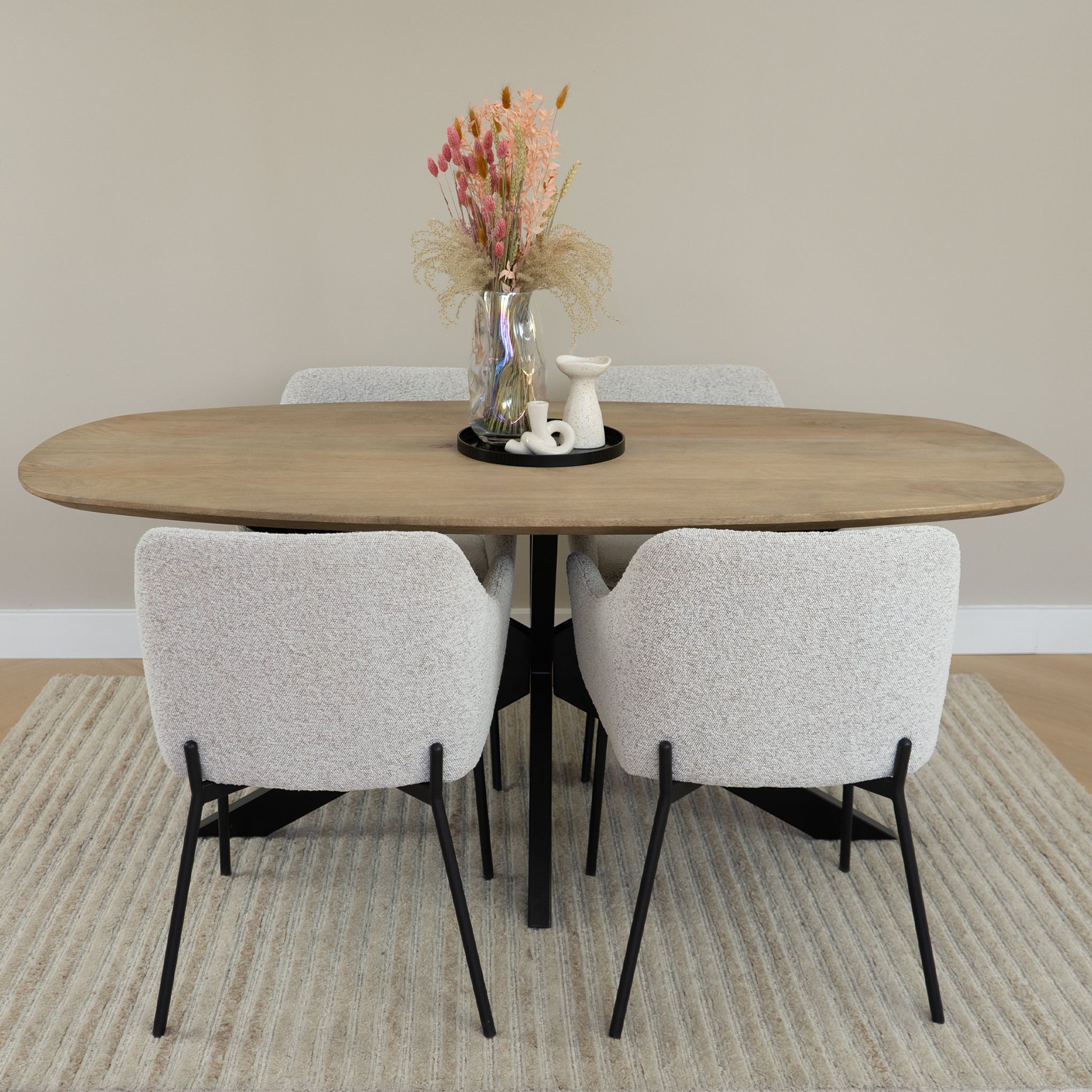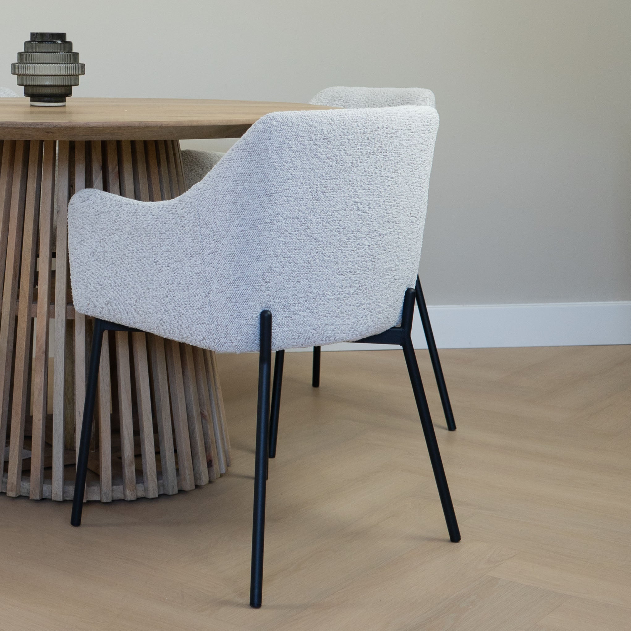 Materiaal keuze Deze eetkamerstoel is bekleed met hoogwaardige bouclé stof, wat een zachte en luxe uitstraling geeft. Bouclé is populair vanwege zijn duurzaamheid en het gemak waarmee je de stof kunt onderhouden. Ideaal voor dagelijks gebruik in een druk huishouden, zonder in te leveren op comfort en stijl.