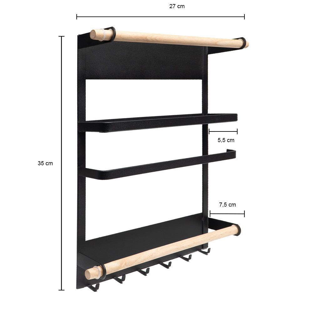 - Het keukenrek in het zwart met magneetstrip is 35 cm hoog, 27 cm breed en 7,5 cm diep.