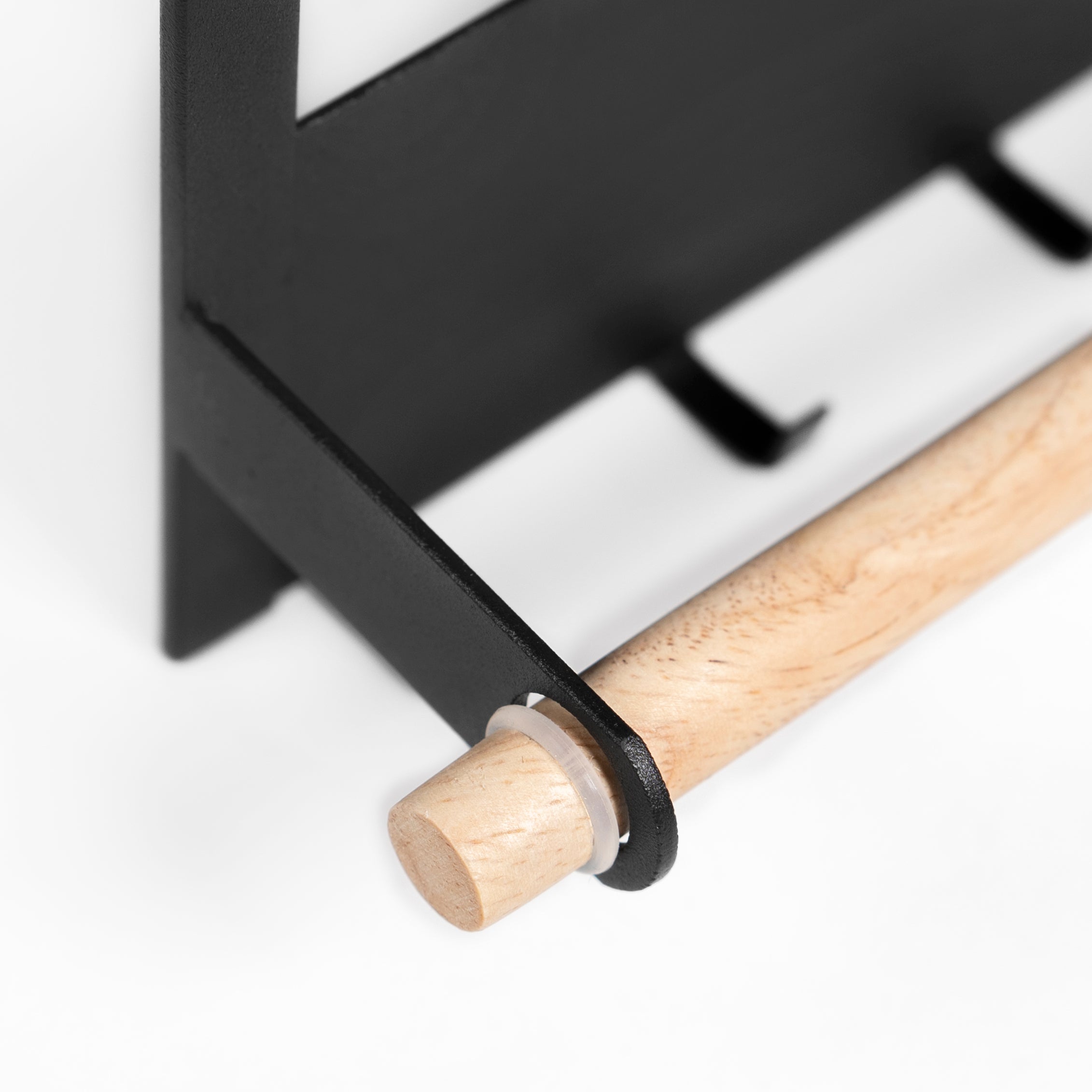 - Achter de onderste houten stang kan je een pannendeksel plaatsen, waarbij de knop zichzelf steunt aan de plank.