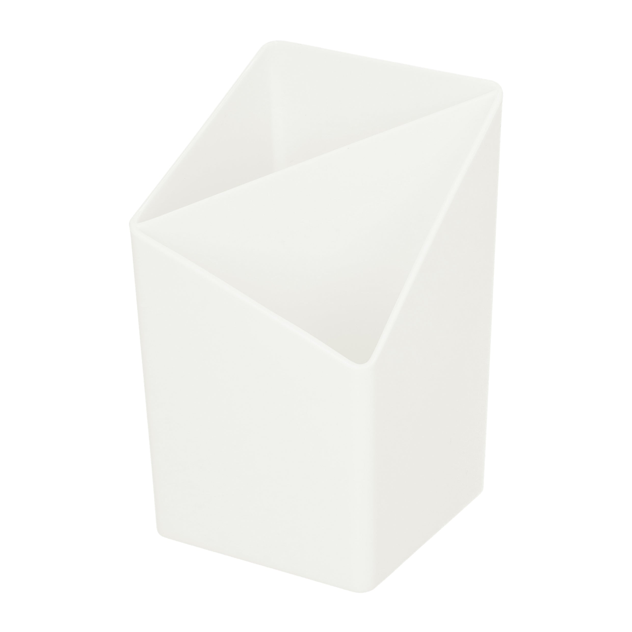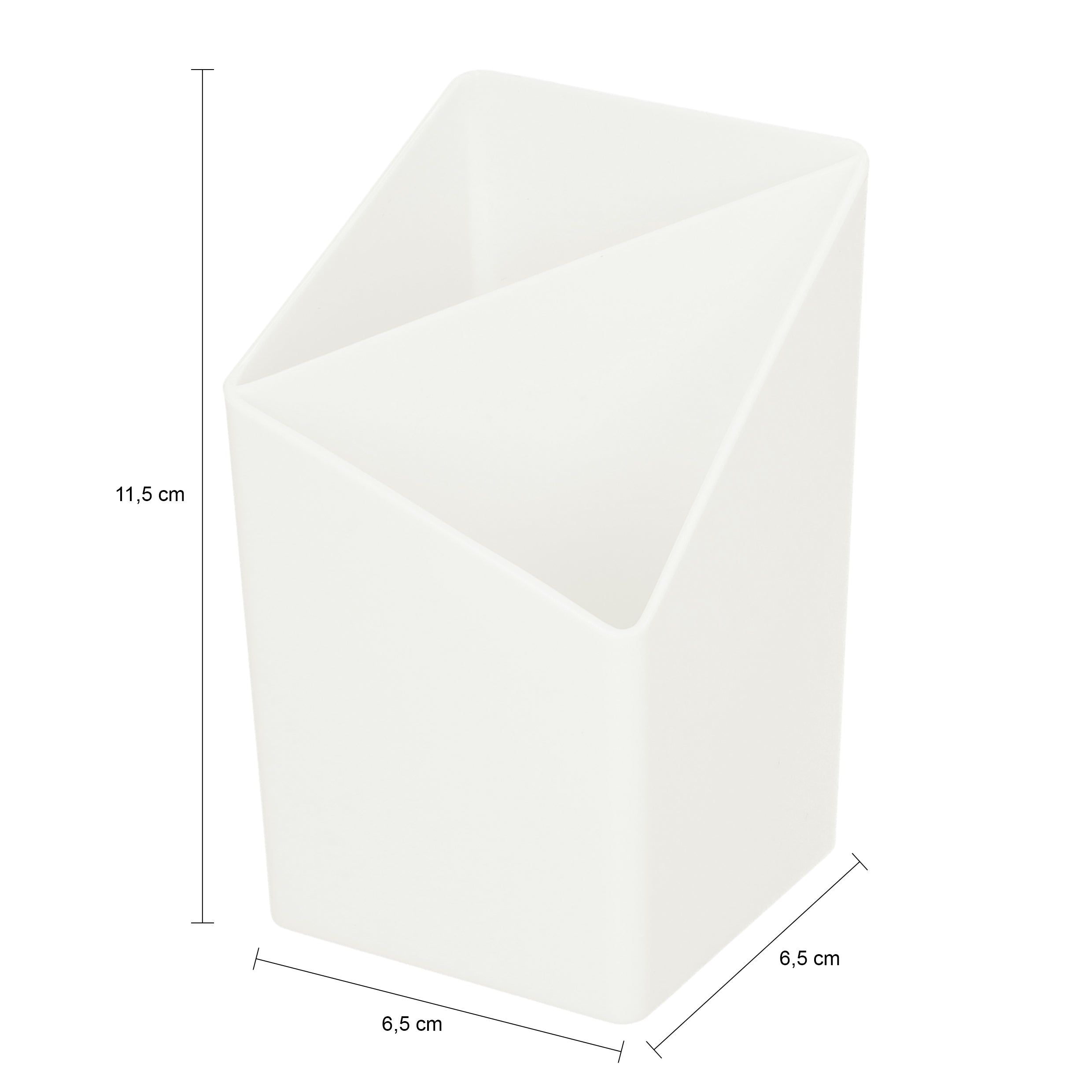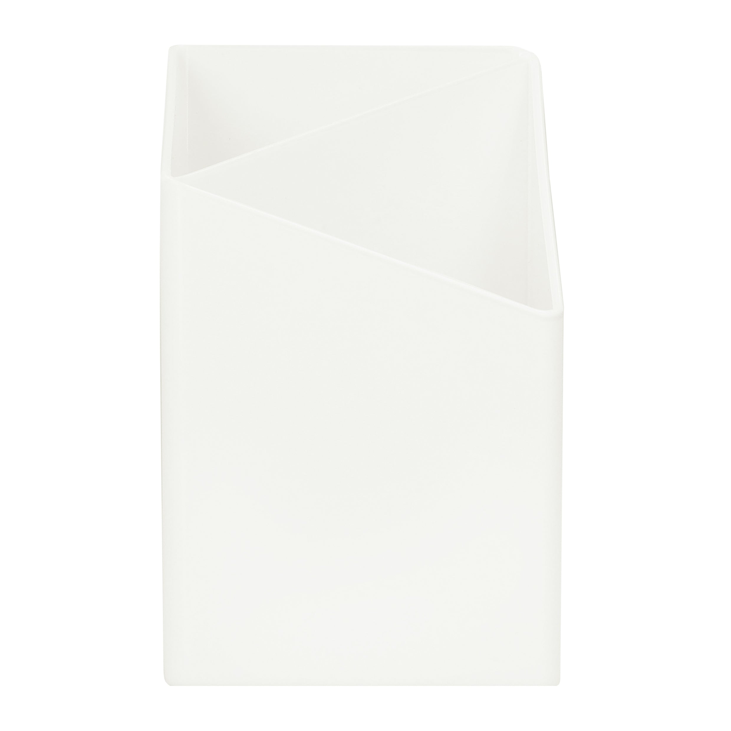- De vierkante houder is diagonaal verdeeld in twee vakken, waarbij de hoogte van de houder in iedere hoek anders is. Dit zorgt voor een speels effect.