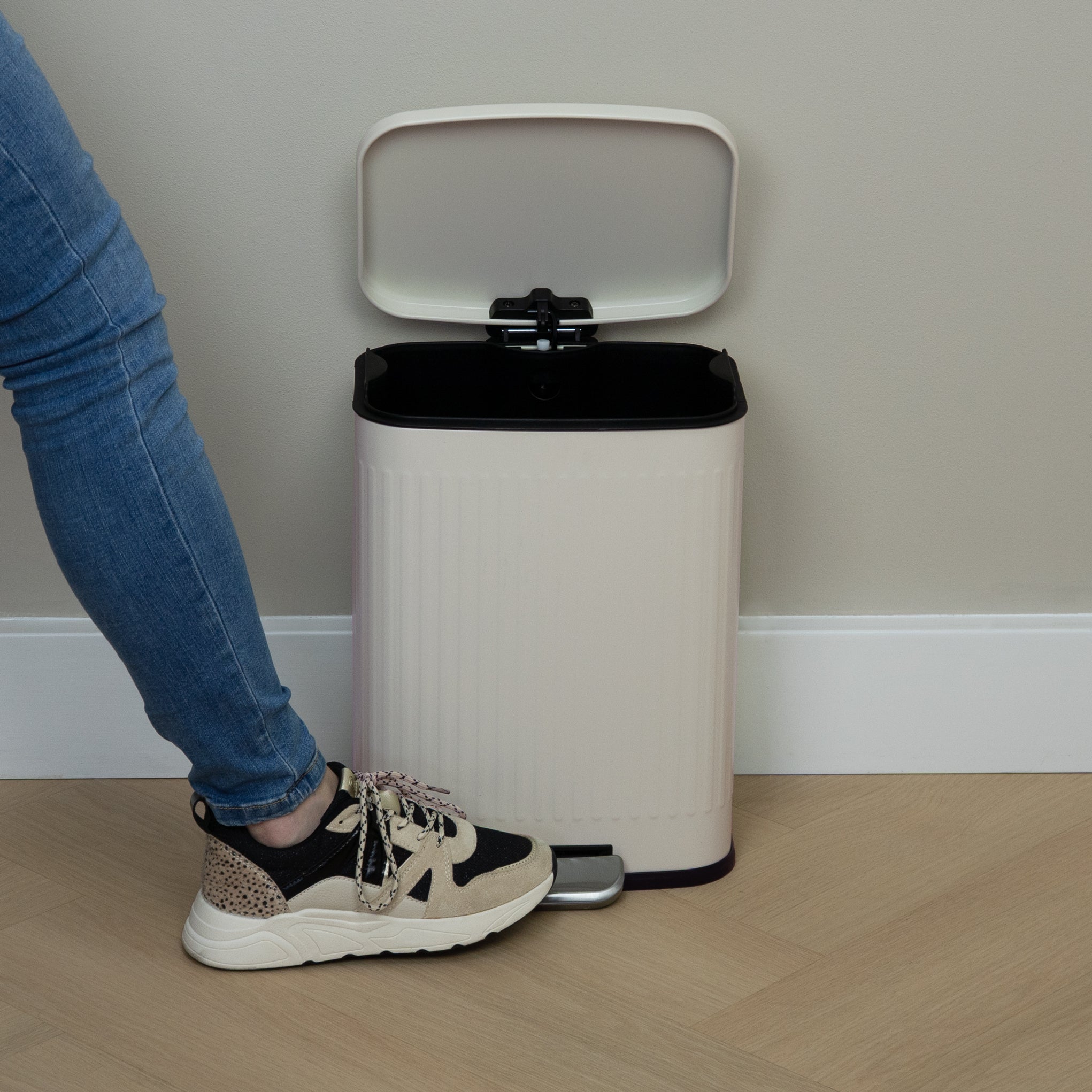 Tijdloos design in warme beige kleur Dankzij het rechthoekig afgeronde design en de warme beige kleur is deze prullenbak een mooie aanvulling op diverse interieurstijlen. Of je nu een modern, Scandinavisch of klassiek interieur hebt, deze stijlvolle afvalbak voegt een rustige en nette uitstraling toe aan elke ruimte. De zachte beige tint zorgt bovendien voor een warme sfeer en laat de vuilnisbak perfect opgaan in de omgeving.