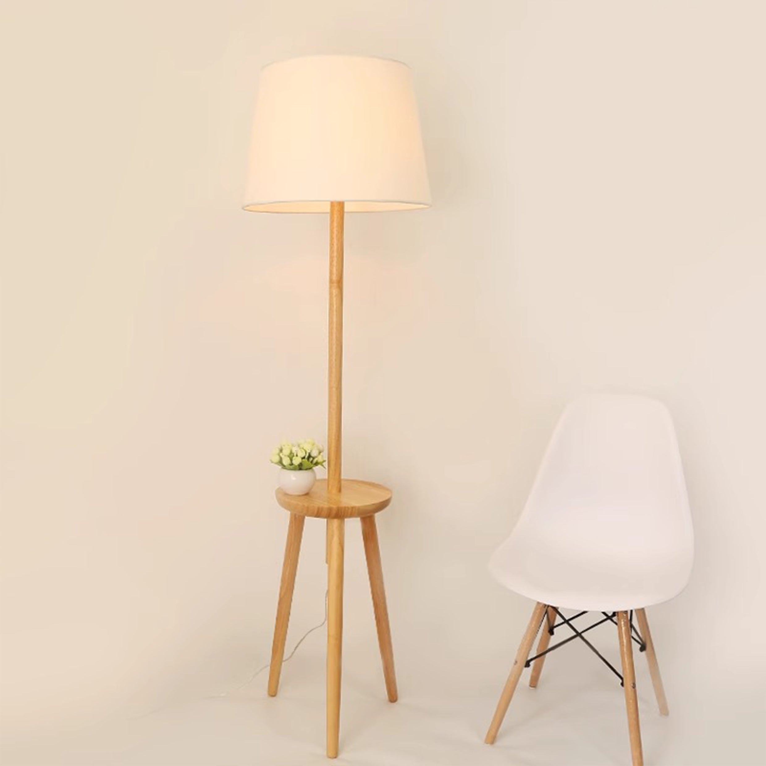 Het ontwerp is minimalistisch maar warm. De combinatie van licht hout met een neutrale kap past moeiteloos in moderne, Scandinavische of landelijke interieurs. De vloerlamp voegt sfeer toe zonder te overheersen, en het plankje geeft net dat beetje extra functionaliteit aan het ontwerp.