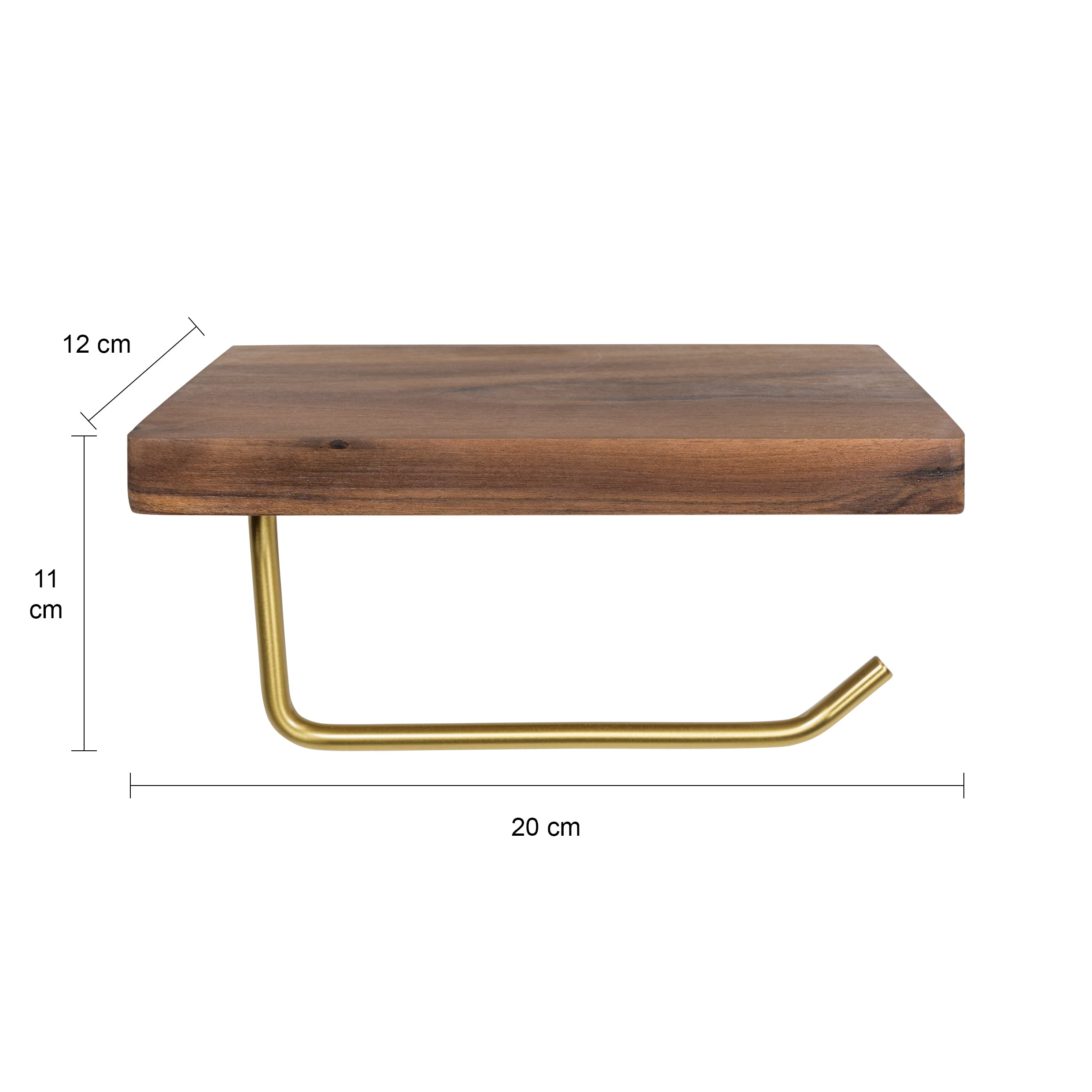 - Het plankje is gemaakt van donkerbruin hout en de gouden stang voor de toiletrol is van messing.
