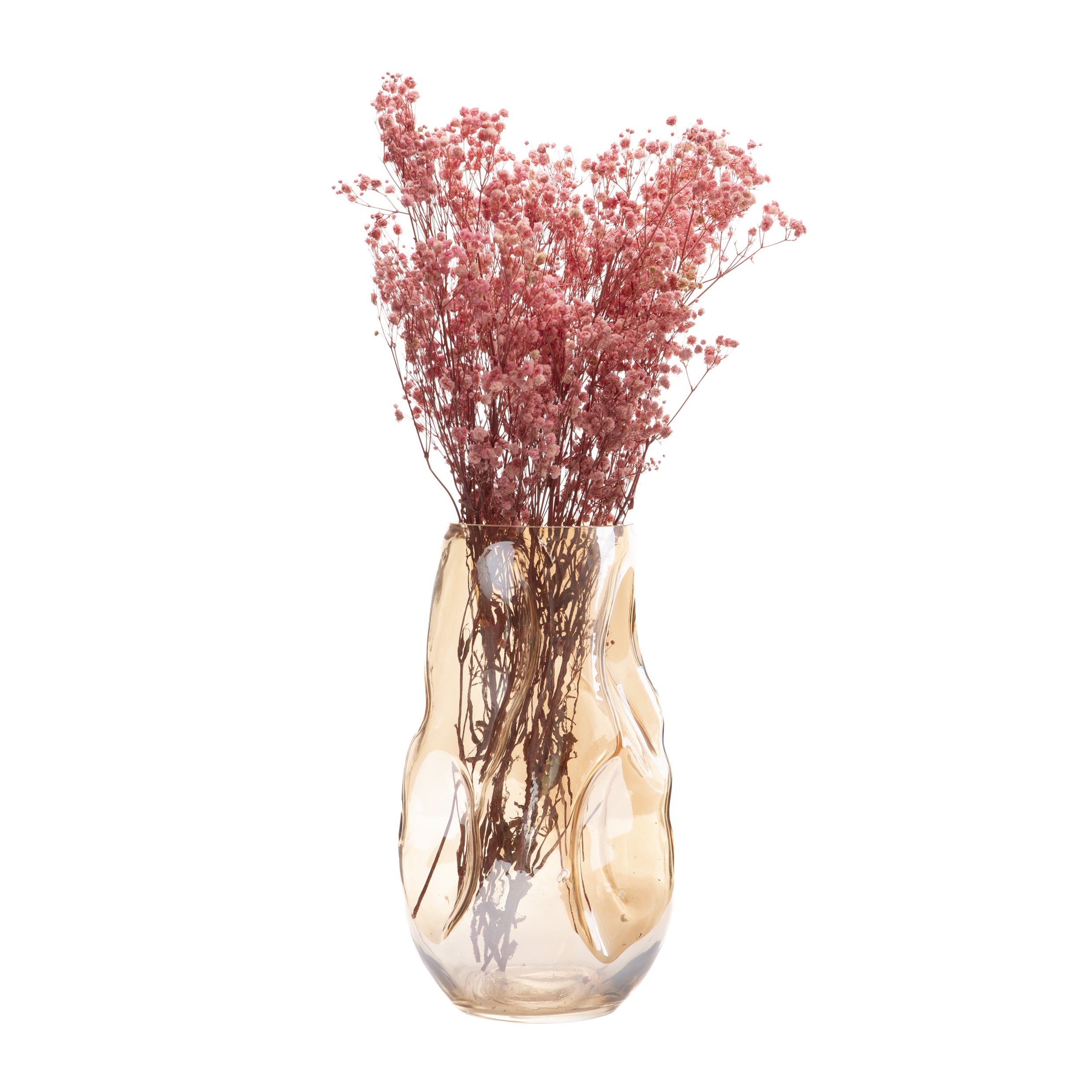 Droogbloemen zijn een echte aanwinst voor jouw interieur. De bloemen blijven lange tijd mooi, waardoor je er dag in dag uit van kunt genieten. De transparant beige kleur van deze vaas met kreukels past perfect bij de neutrale kleuren van een bosje droogbloemen. De vaas is niet zo heel groot, waardoor een klein bosje droogbloemen perfect tot z’n recht komt. Ook geef je de vaas door het beperkte formaat heel eenvoudig een plekje in jouw interieur. Vul de vaas met jouw favoriete bloemen