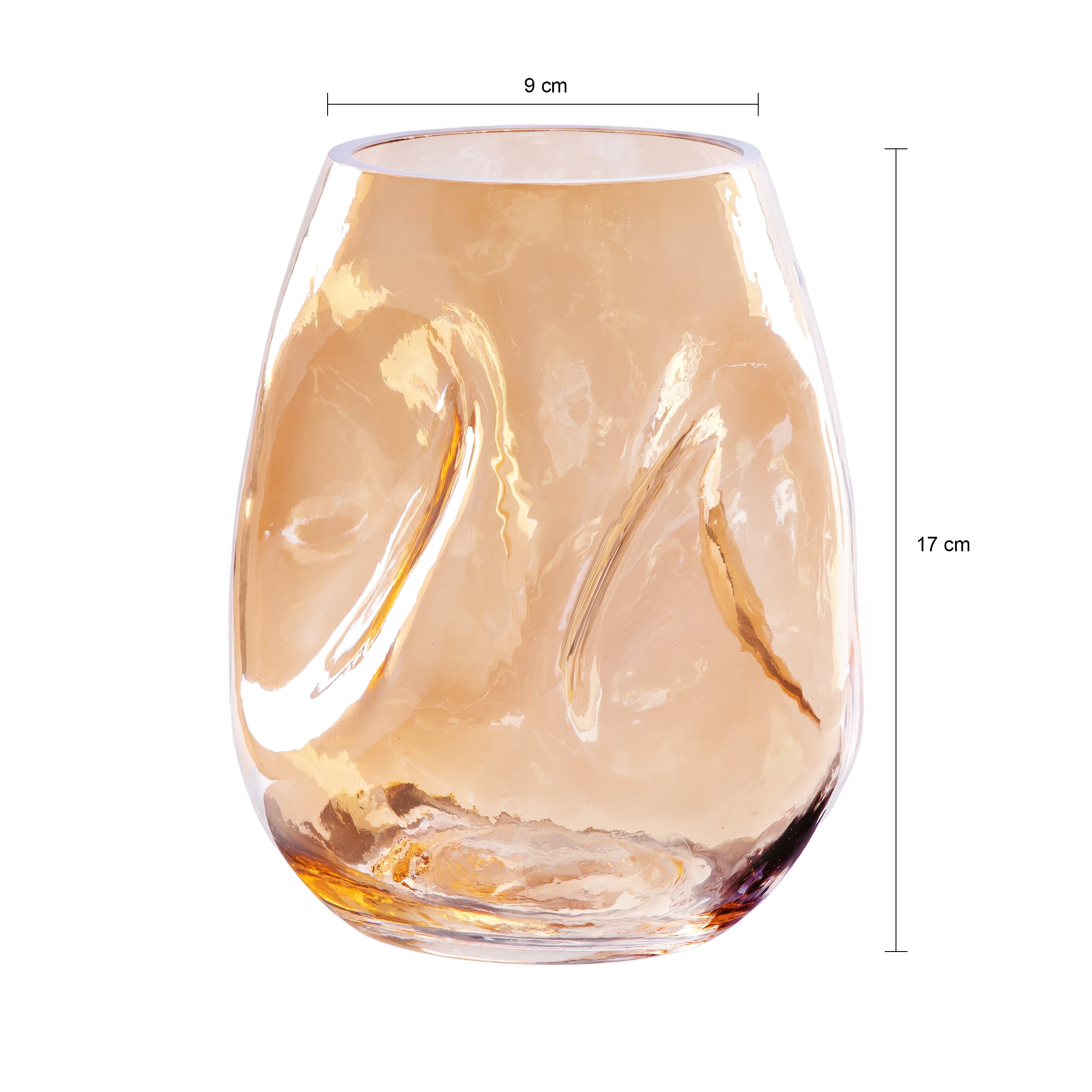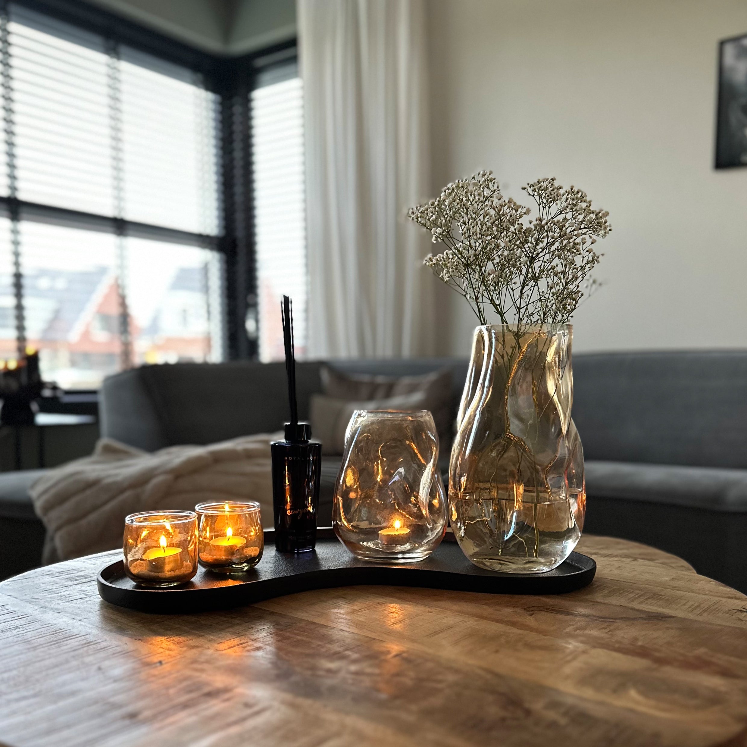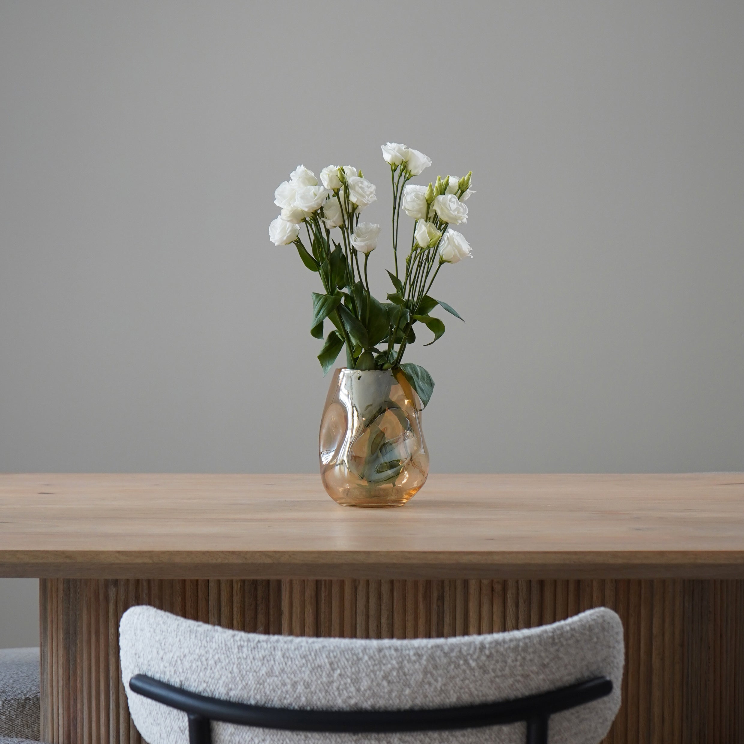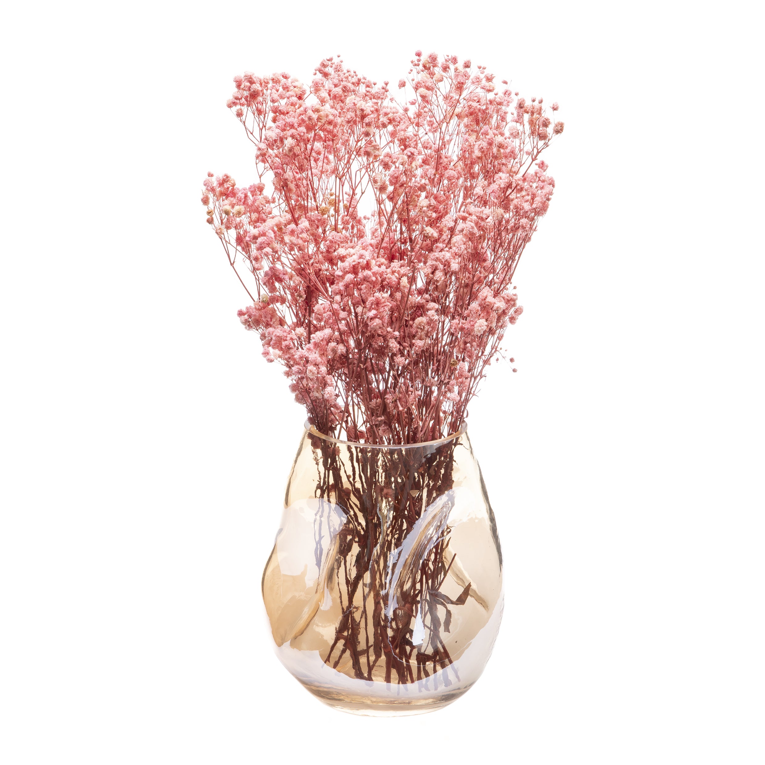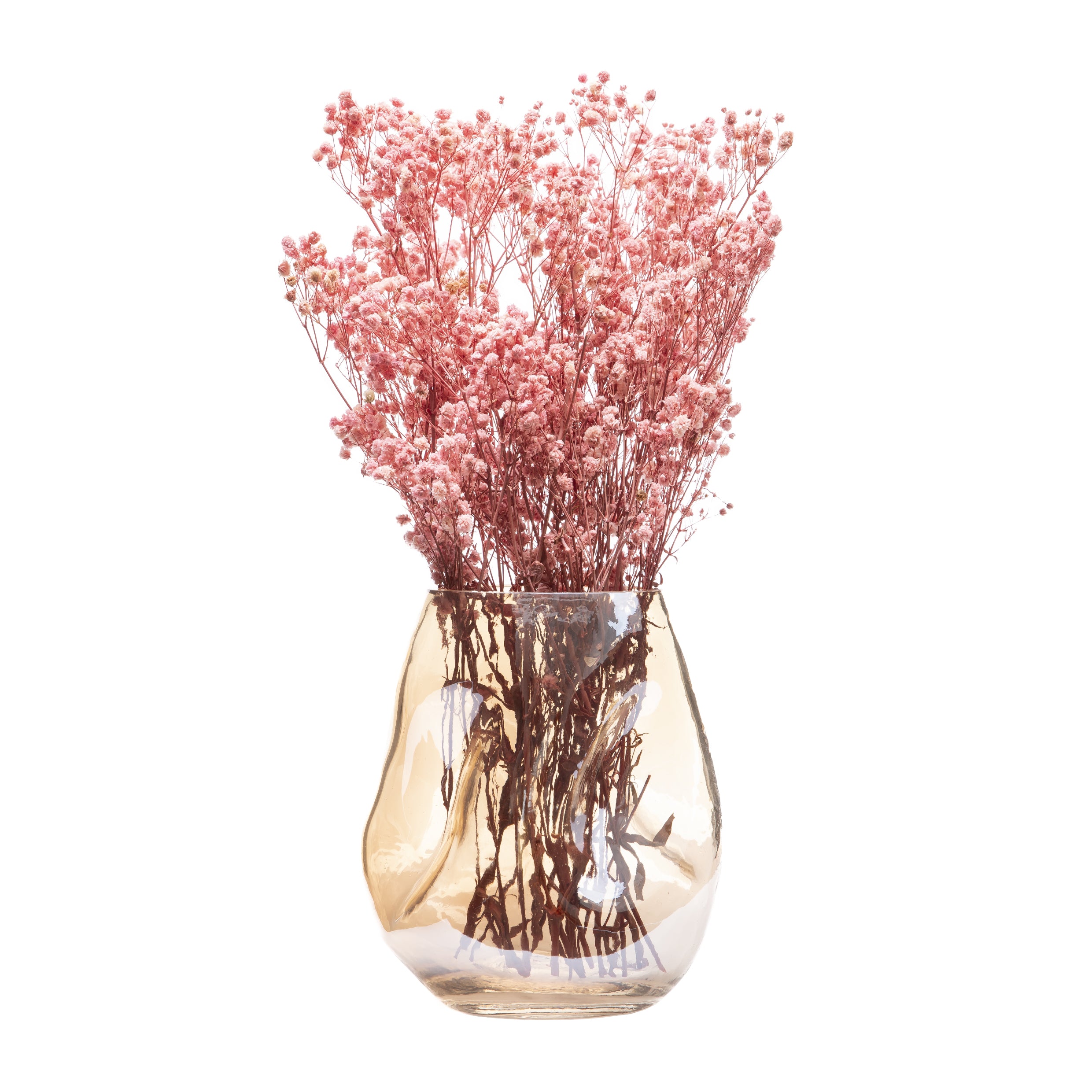 Droogbloemen zijn een echte aanwinst voor jouw interieur. De bloemen blijven lange tijd mooi, waardoor je er dag in dag uit van kunt genieten. De transparant beige kleur van deze vaas met kreukels past perfect bij de neutrale kleuren van een bosje droogbloemen. De vaas is niet zo heel groot, waardoor een klein bosje droogbloemen perfect tot z’n recht komt. Ook geef je de vaas door het beperkte formaat heel eenvoudig een plekje in jouw interieur. Vul de vaas met jouw favoriete bloemen