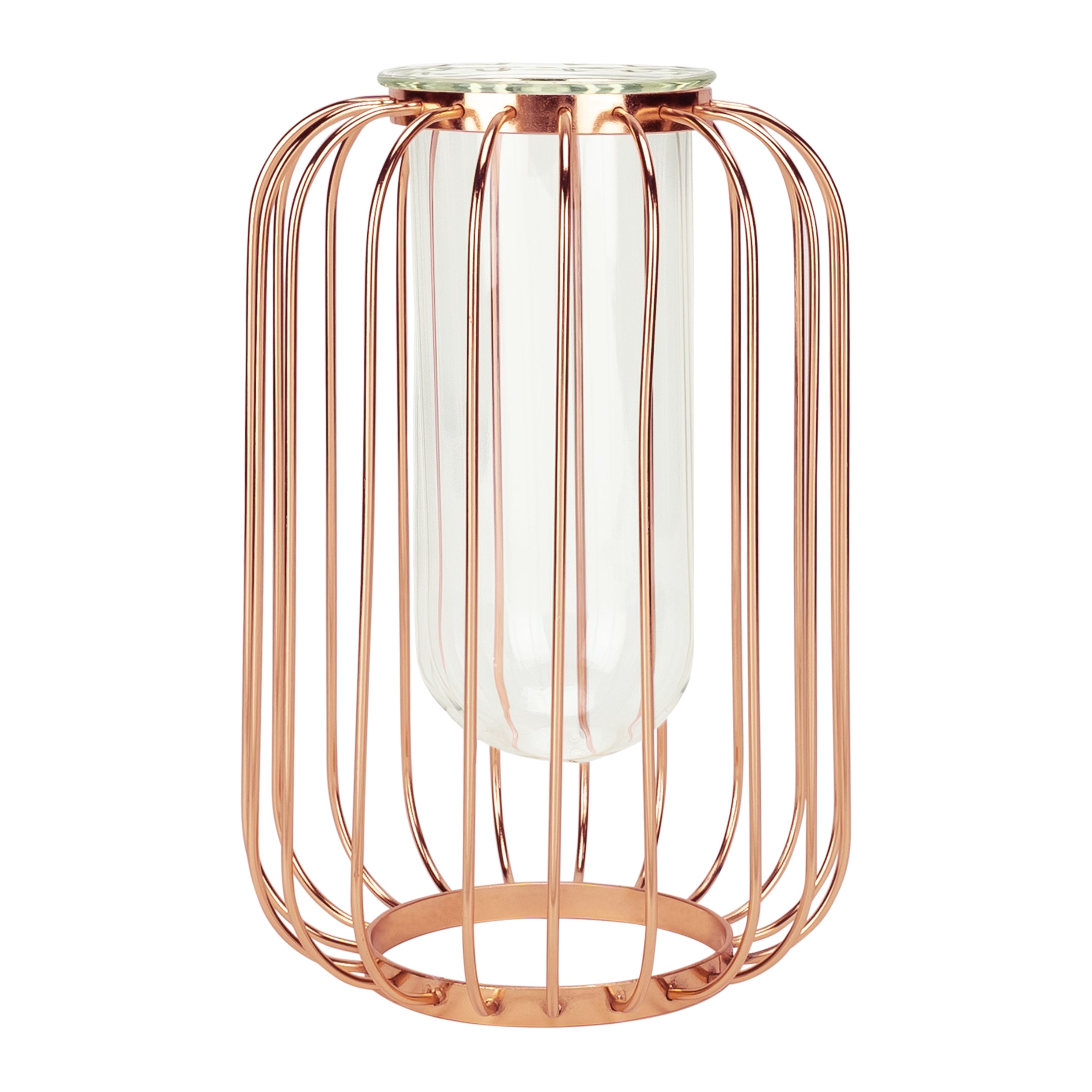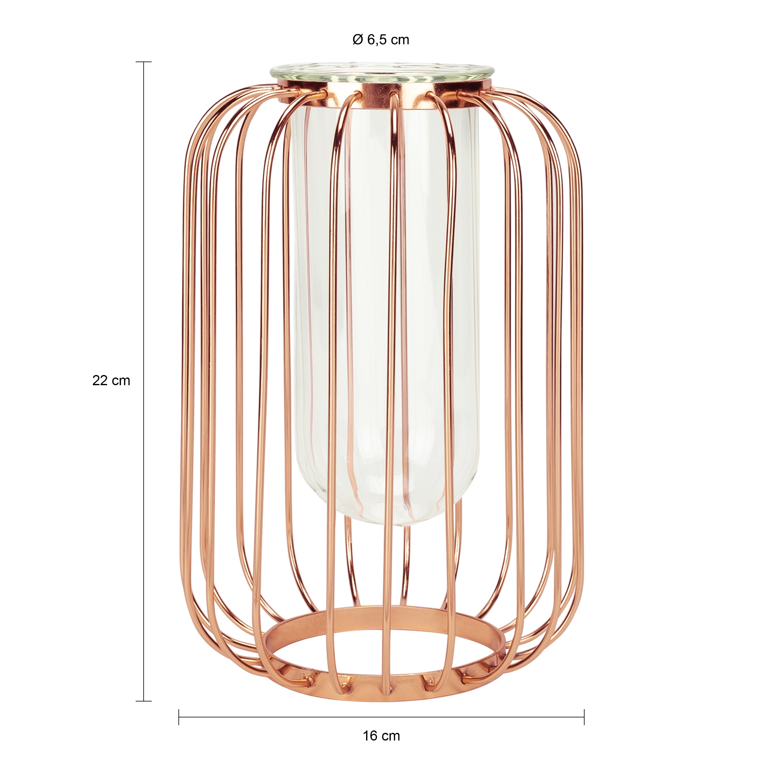 - De vaas is gemaakt van glas en draadstaal.