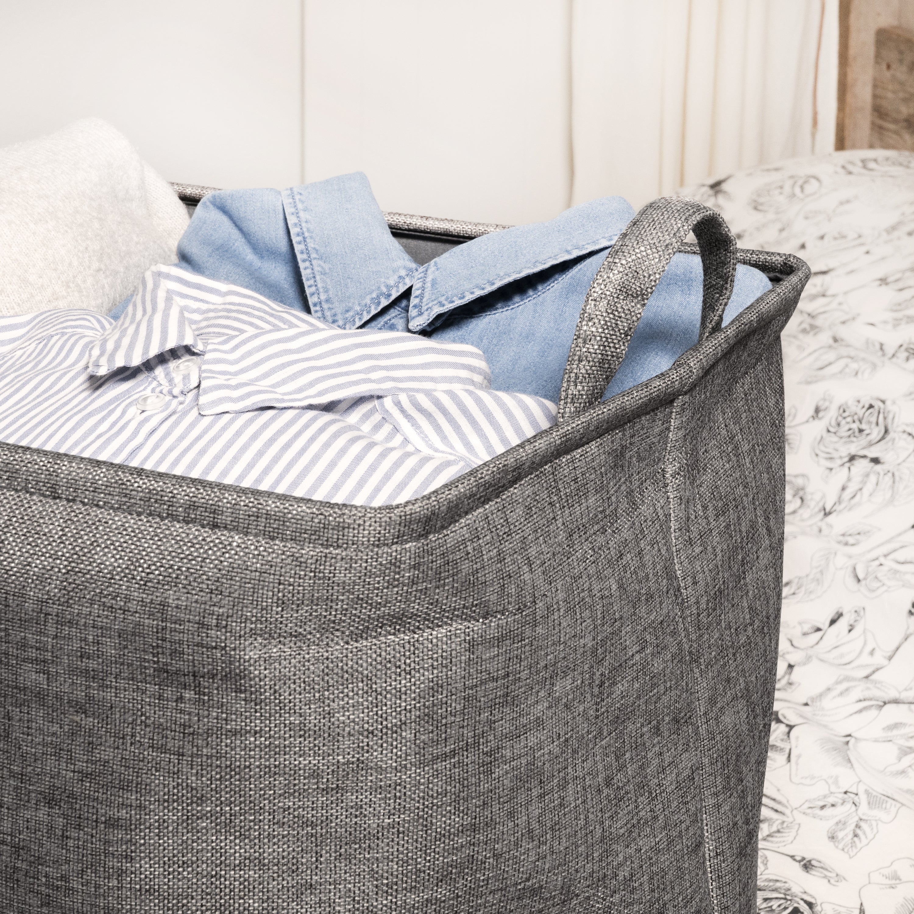 - Deze wasmand met handvaten in het grijs past perfect in elk interieur.
