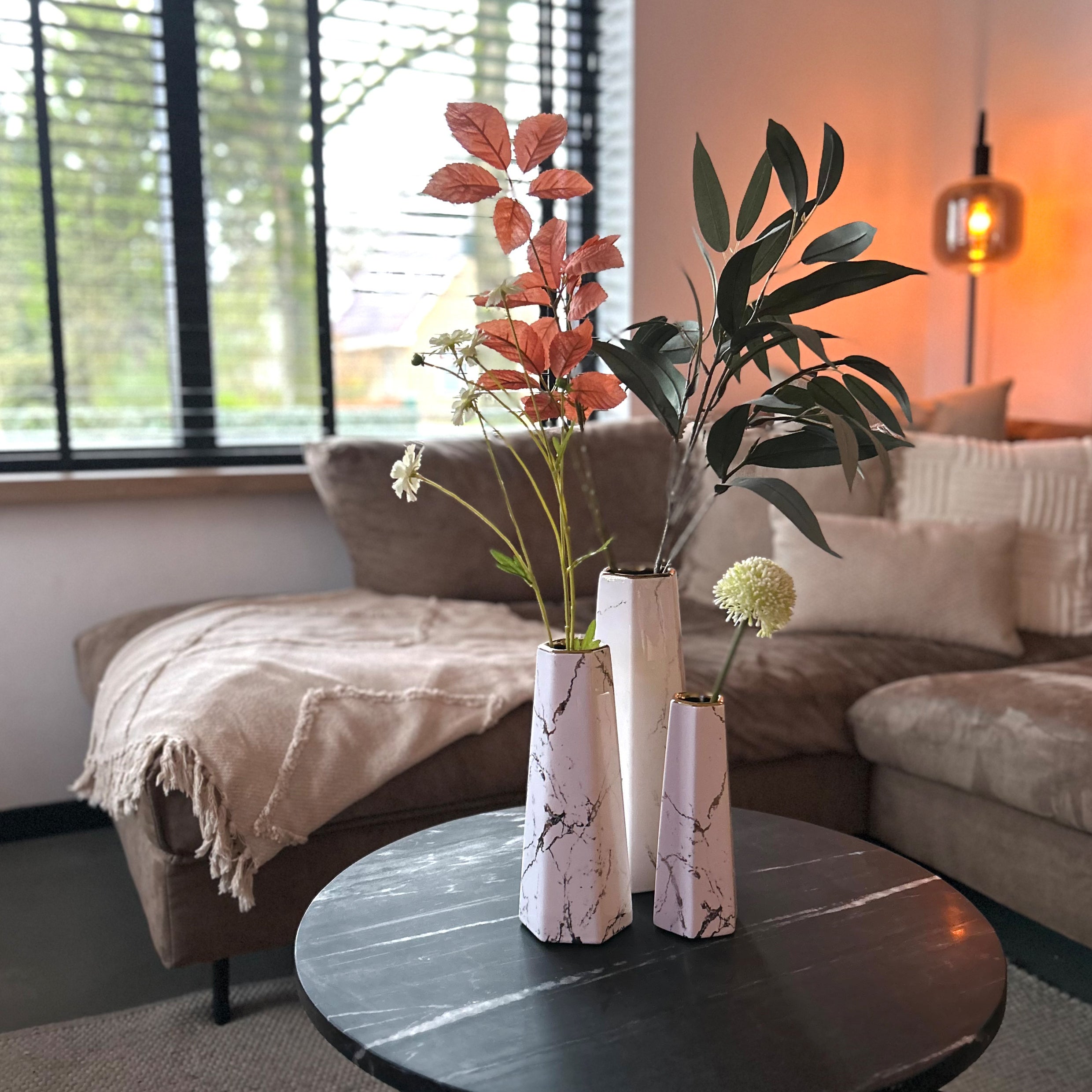 - De vaas ziet eruit alsof hij van marmer is gemaakt, terwijl de bloemenvaas in werkelijkheid van het materiaal keramiek gemaakt is.