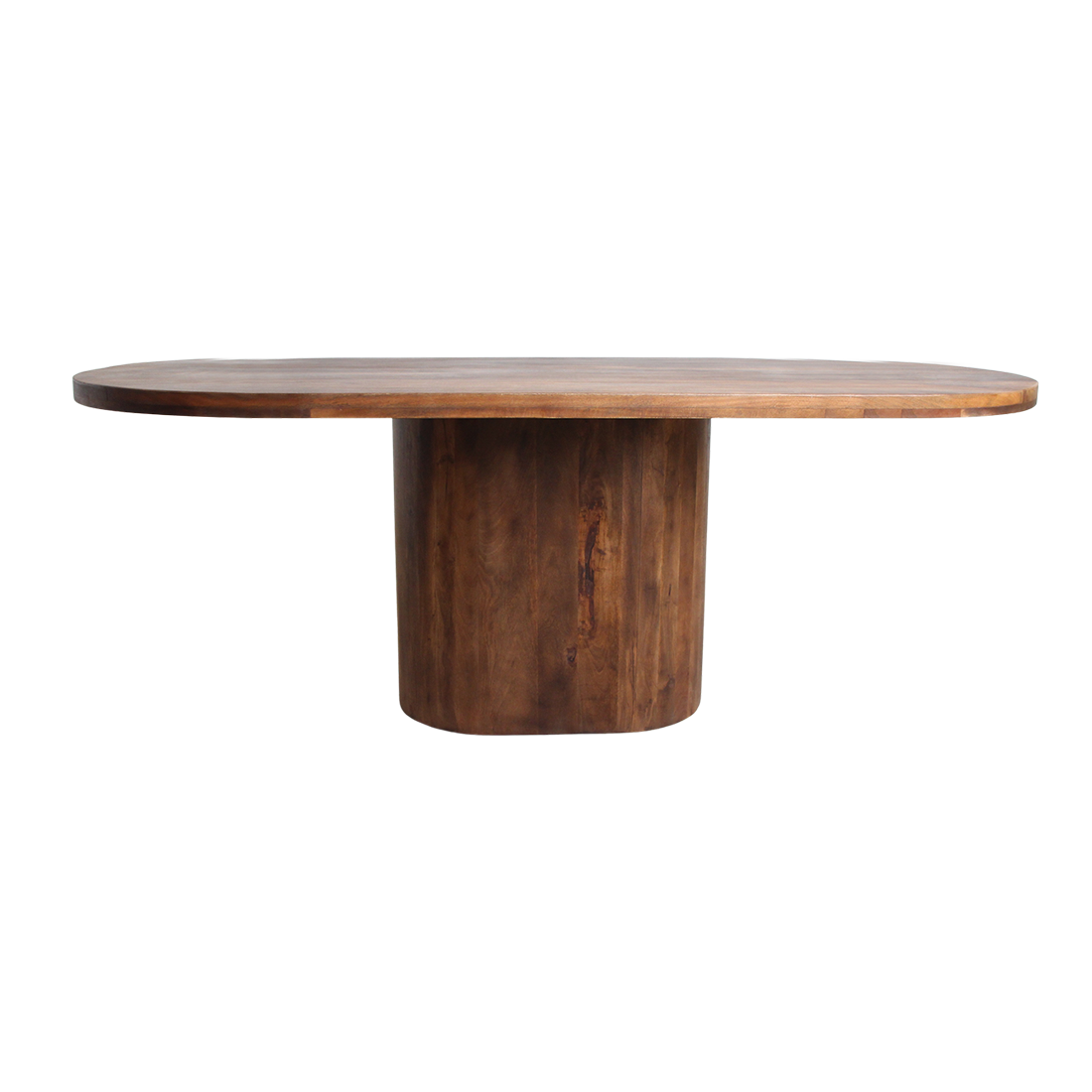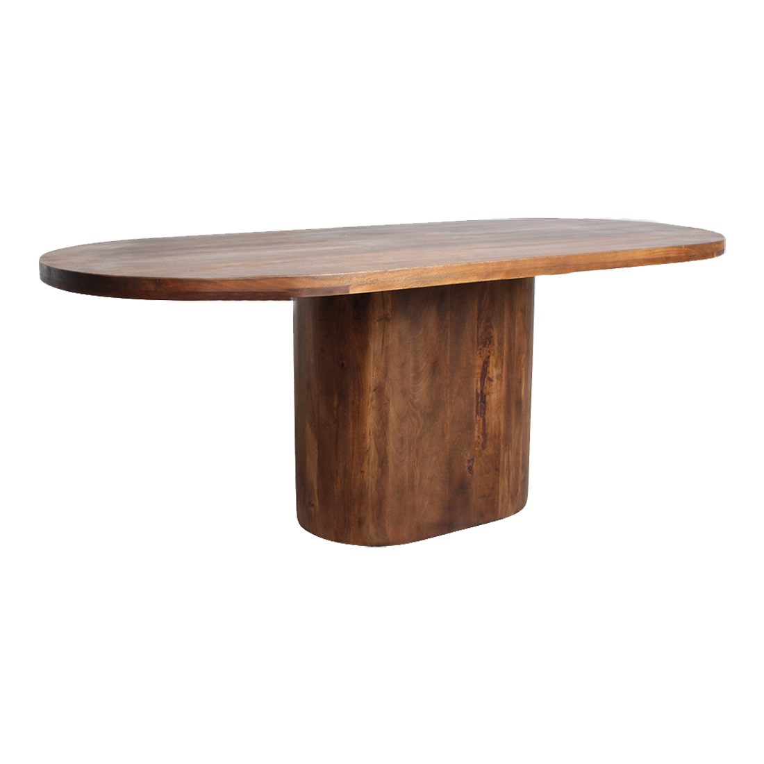 - Ovaal tafelblad van massief mangohout met afgeronde hoeken en warme uitstraling.