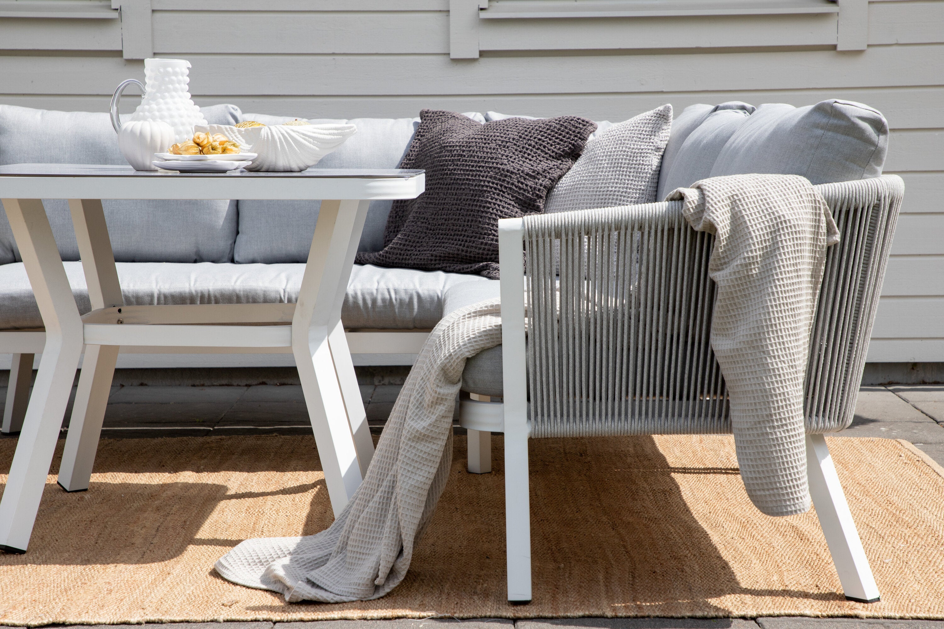 - Creëer een stijlvolle en ontspannen sfeer met de duurzame loungeset Amary, gemaakt van wit gepoedercoat aluminium en lichtgrijs touw.