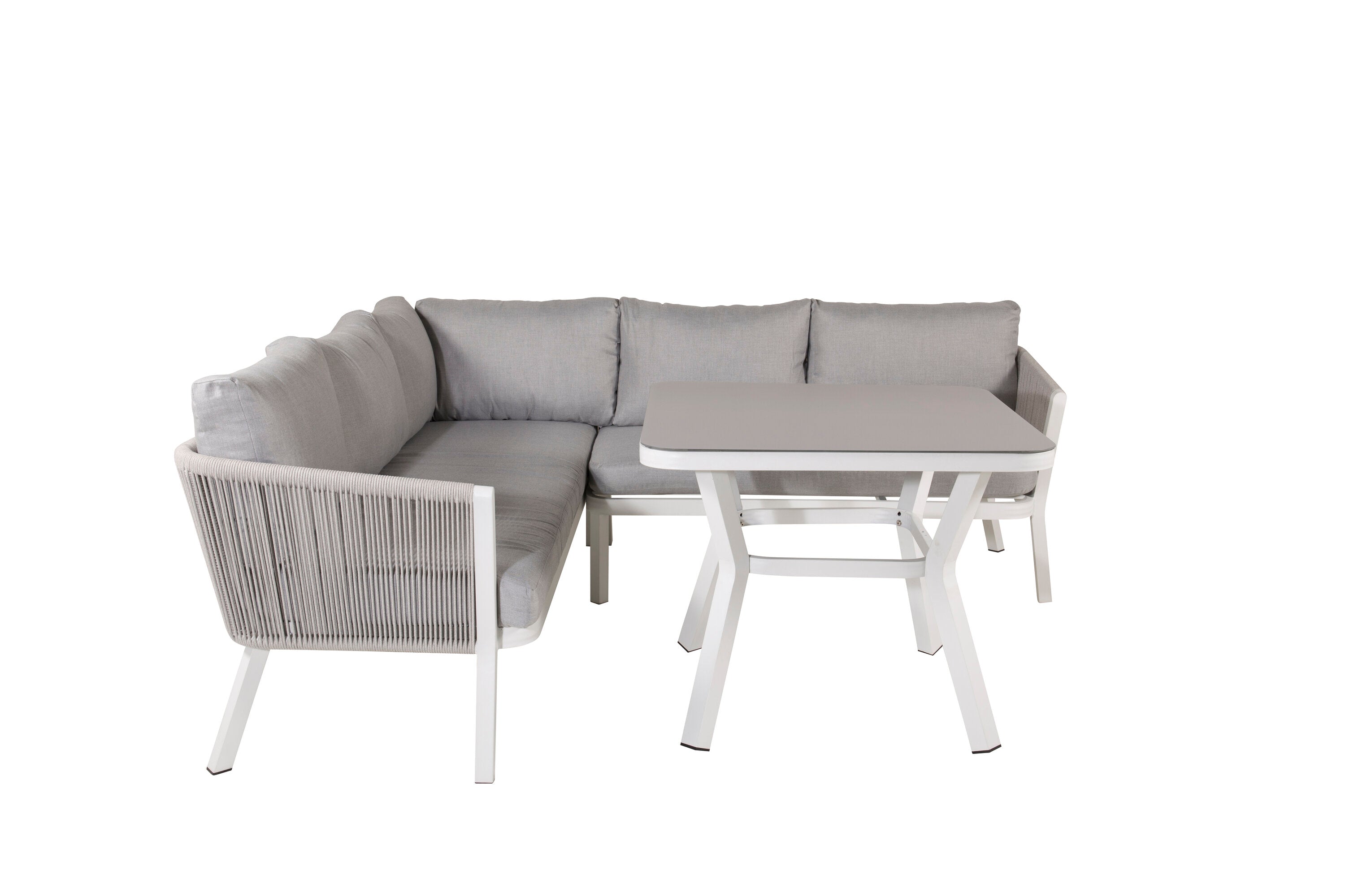 Amary is een moderne loungeset, met de nadruk op comfort en design die gegarandeerd een succes zal zijn in jouw tuin deze zomer! De loungeset bestaat uit een hoekbank gemaakt van duurzaam wit gepoedercoat aluminium met een rugleuning in lichtgrijze touw. De loungeset bevat ook een rechthoekige hoge salontafel met een tafelblad met een grijze afwerking en zachte, lichtgrijze kussens.