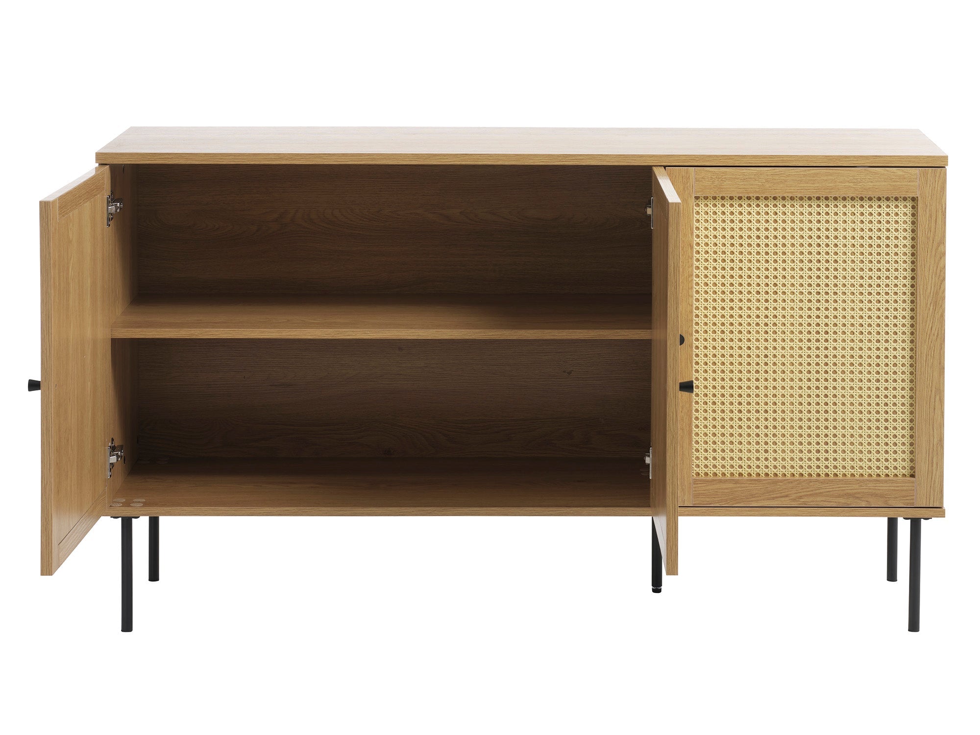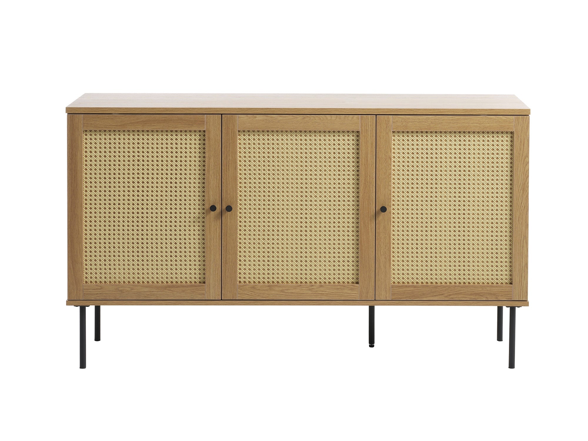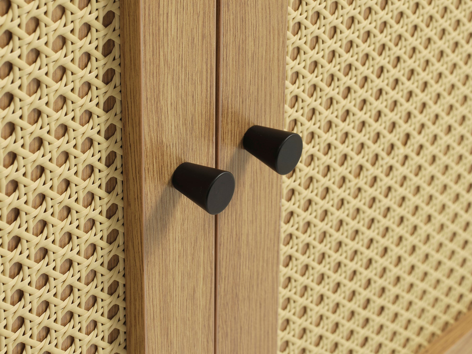 Het dressoir beschikt over drie deurtjes, elk voorzien van prachtige rotan details die een charmant en natuurlijk accent toevoegen. Achter de deurtjes vind je één plank die zorgt voor optimale opbergruimte voor al je spullen. De zwart metalen greepjes en pootjes versterken de moderne uitstraling en bieden een stevige basis.