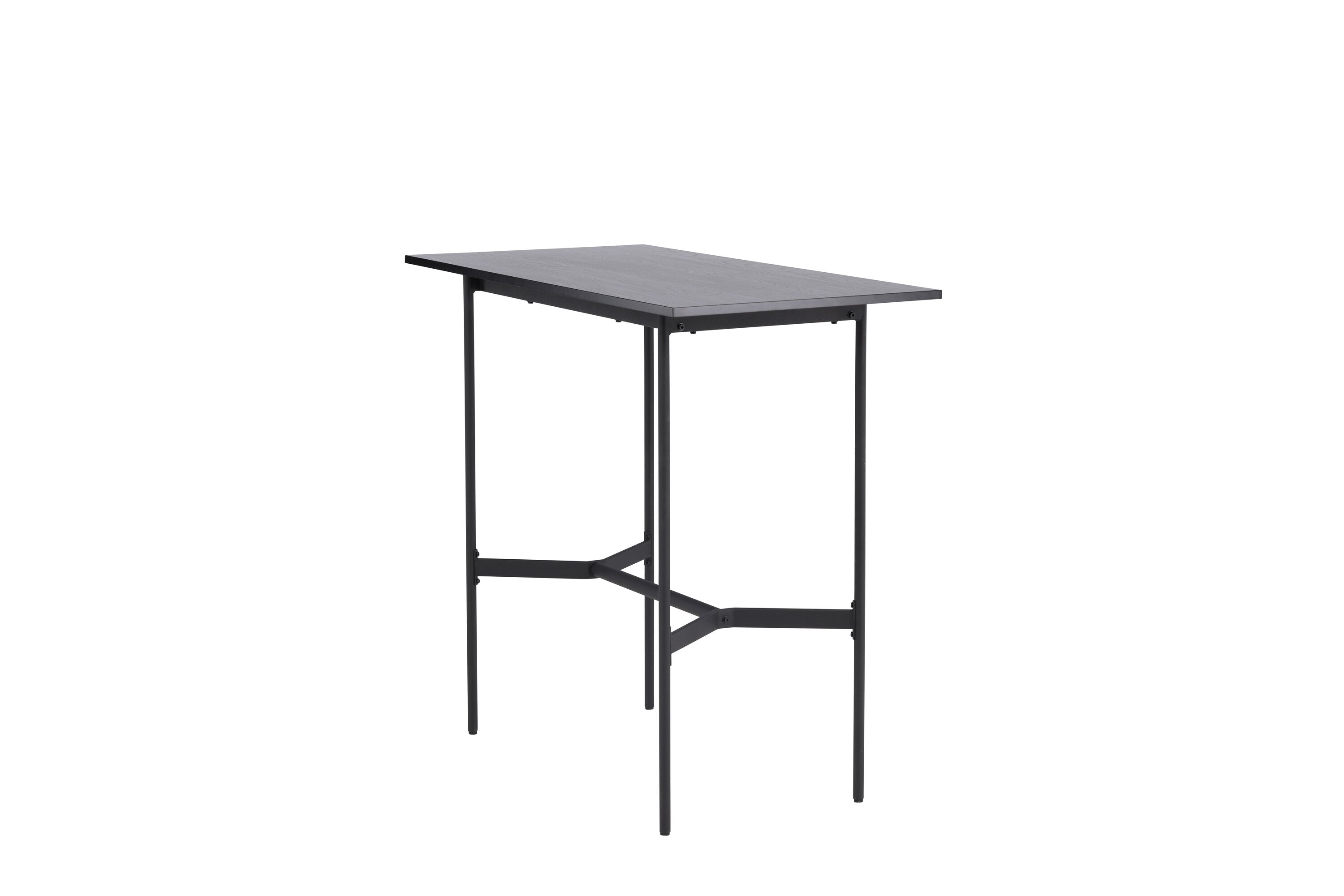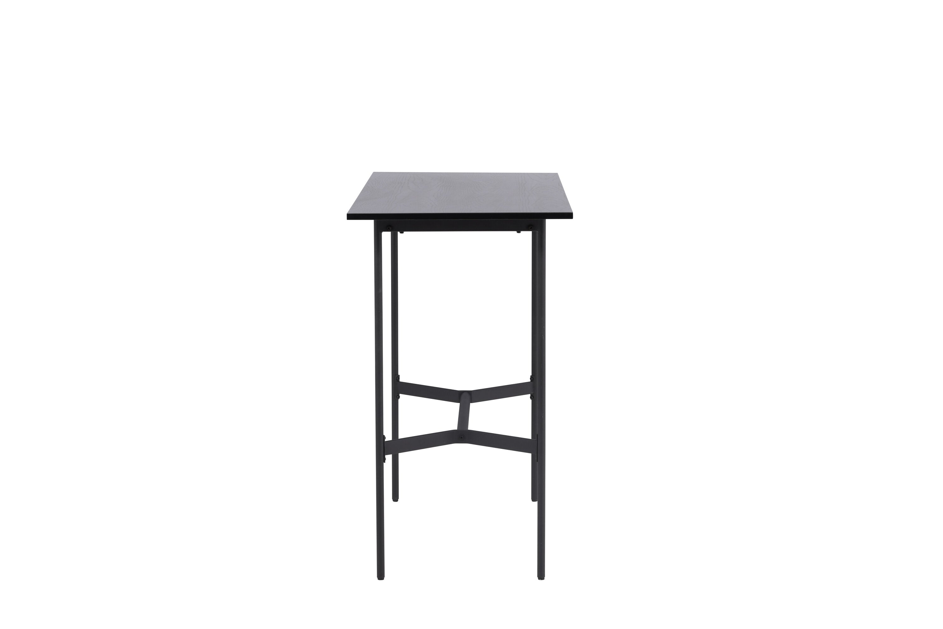 - De Hatan bartafel heeft een dun tafelblad van zwart MDF en slanke tafelpoot met geïntegreerde zwarte metalen voetsteun.