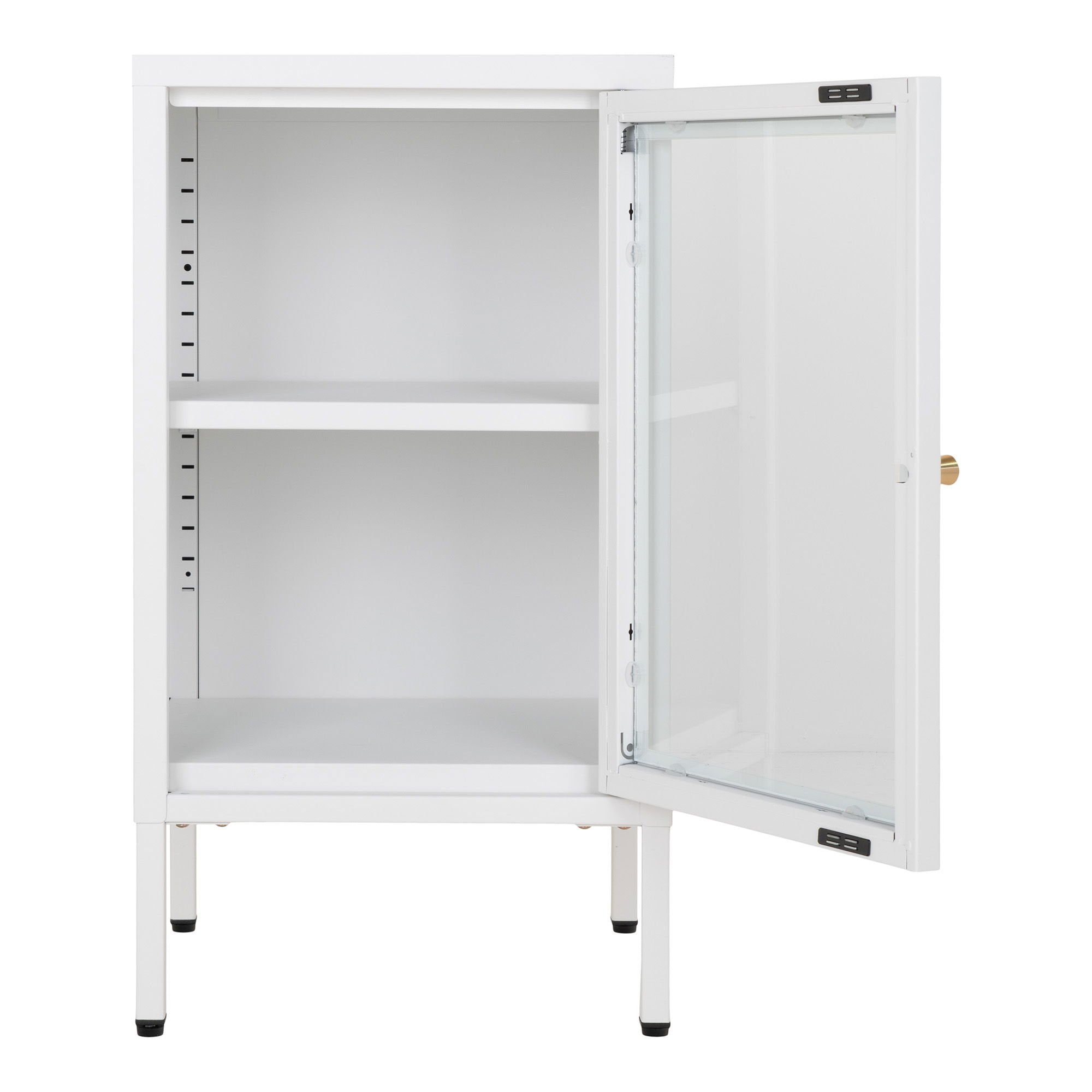 Gemaakt van wit staal, straalt deze vitrinekast een moderne en industriële look uit. De enkele glazen deur met een strakke, minimalistische afwerking voegt een verfijnde touch toe aan het ontwerp, terwijl de glazen voorkant de inhoud subtiel laat zien. Binnenin biedt een plank voldoende ruimte om je spullen georganiseerd en binnen handbereik te houden.