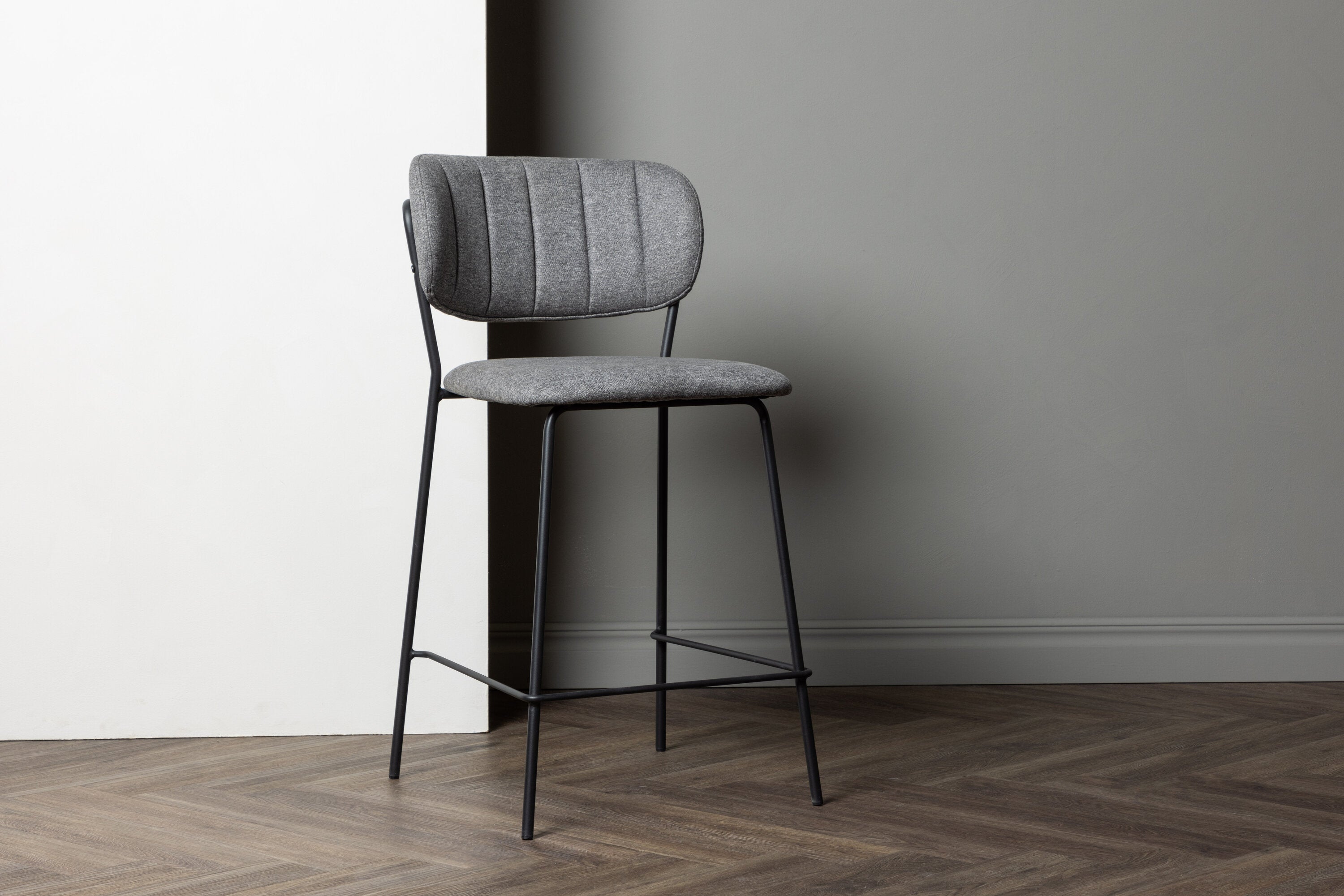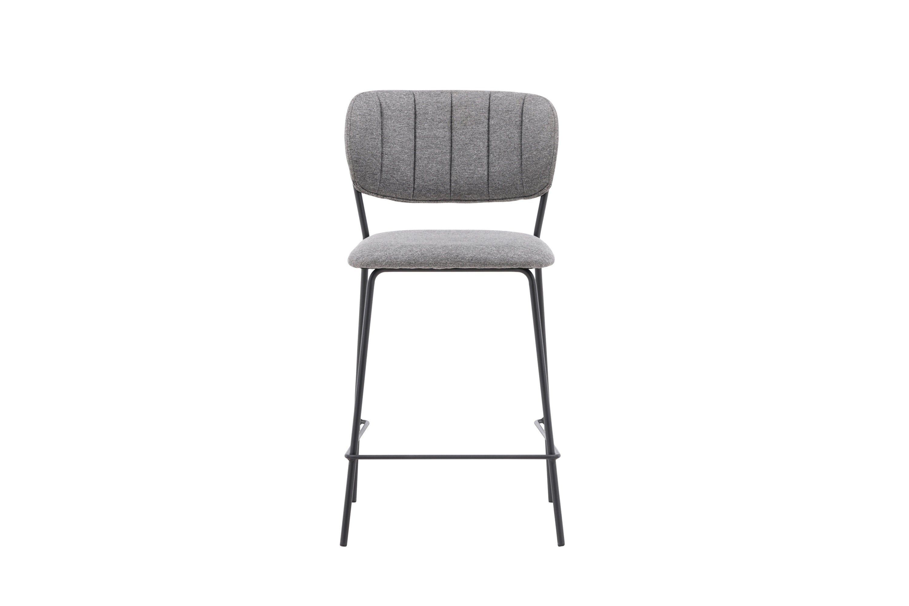 - Deze barkruk heeft een volledig bekleed ontwerp met een licht gebogen rug en zitting in grijze polyester stof met stijlvolle decoratieve stiksels.