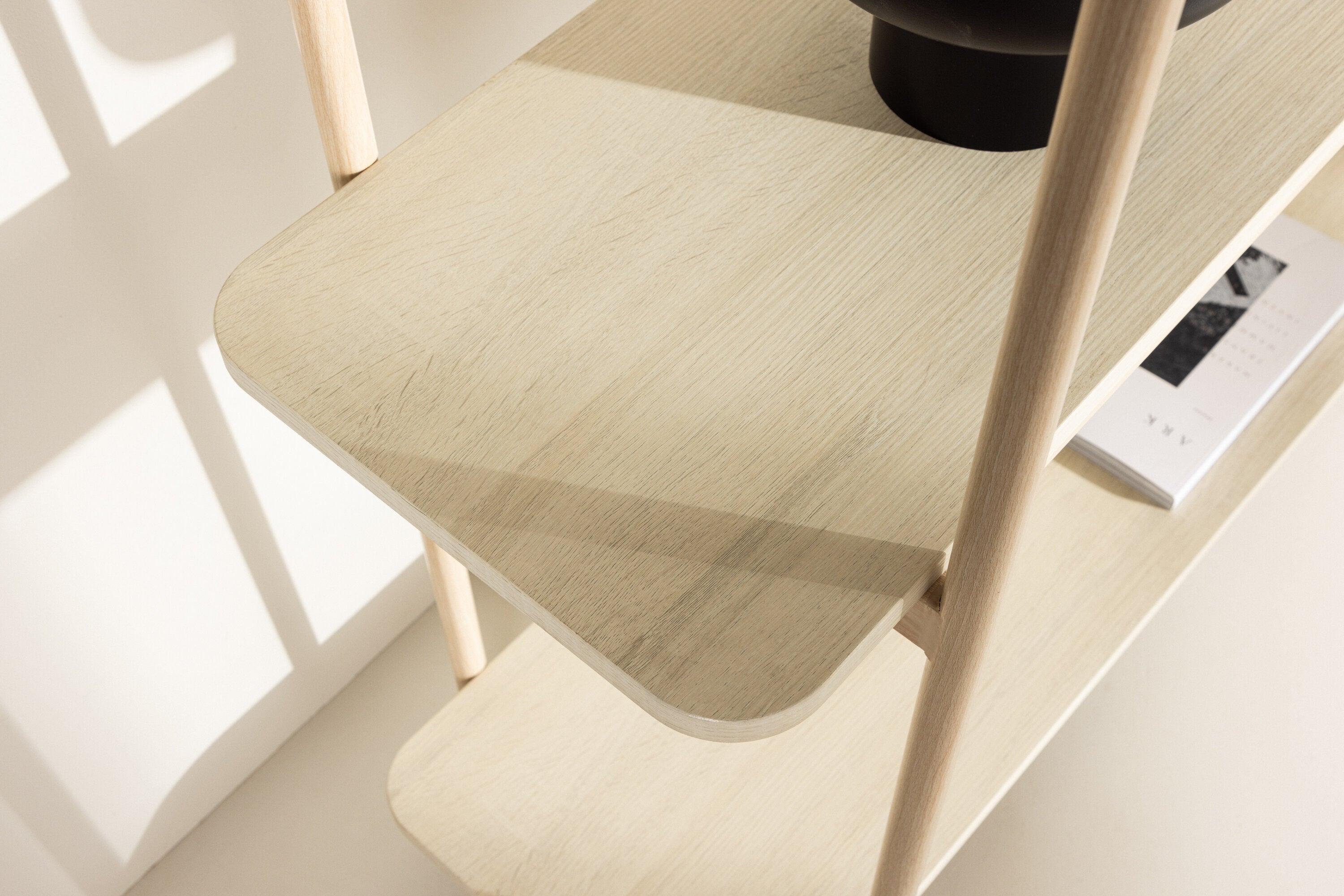 Het slanke stalen frame dat de console tafel ondersteunt, voegt minimalisme toe aan het middelpunt en is in een warme beige tint. De drie planken met afgeronde hoeken bieden je voldoende ruimte om je favoriete decoraties, boeken en planten trots tentoon te stellen. Het 100% FSC-gecertificeerde witte hout creëert een gevoel van lichtheid en frisheid in de kamer.