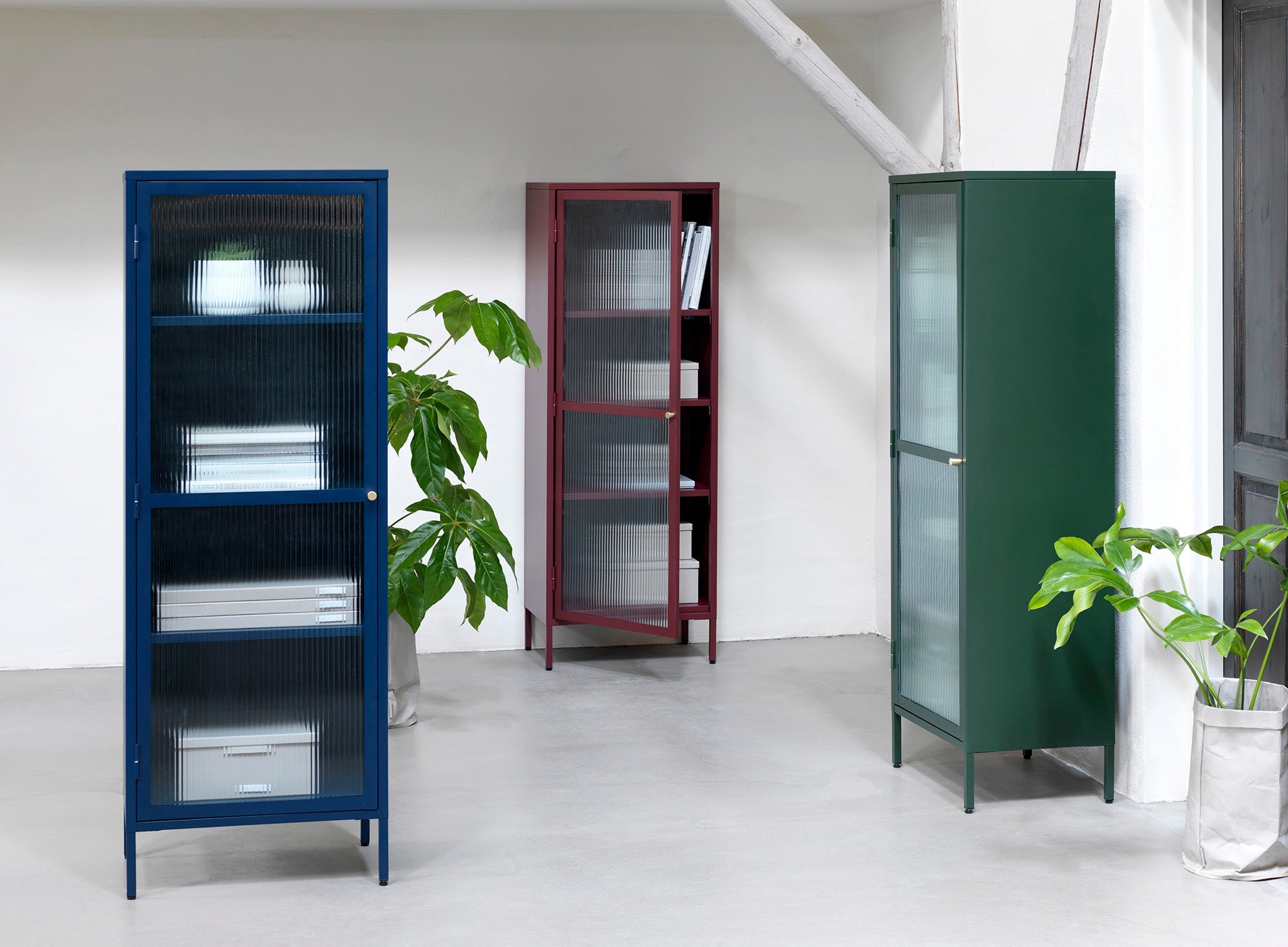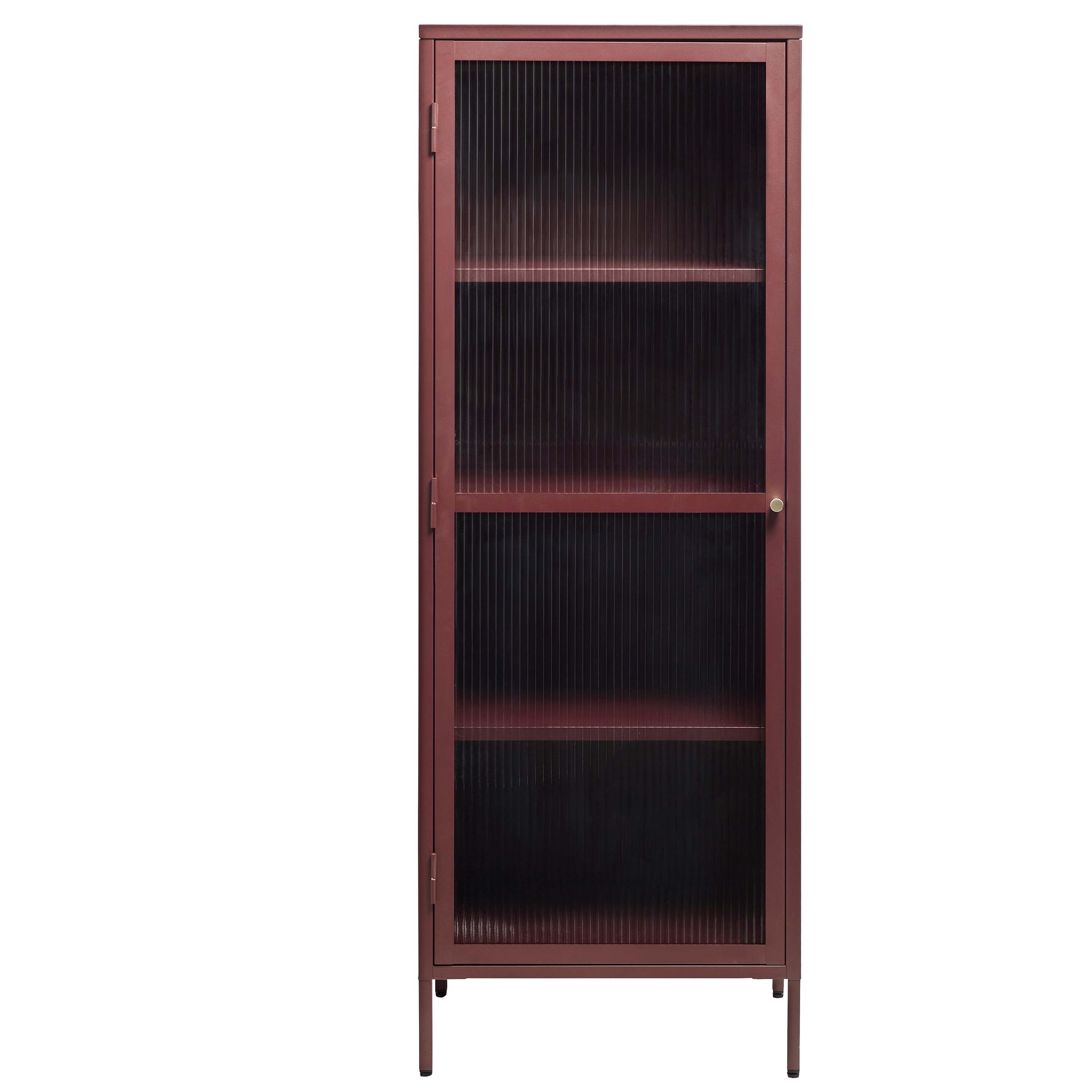 Wat de Omeo Vitrinekast echt uniek maakt, is zijn uitgesproken kleur bordeauxrood, wat direct de aandacht trekt en een krachtig statement maakt in elke ruimte. De kast is voorzien van een glazen deur met prachtige geribbelde glasdetails, die niet alleen een stijlvolle uitstraling geeft, maar ook zorgt voor een subtiel spel van licht en schaduw in de kast. De messing knop voegt een vleugje luxe toe aan het geheel.