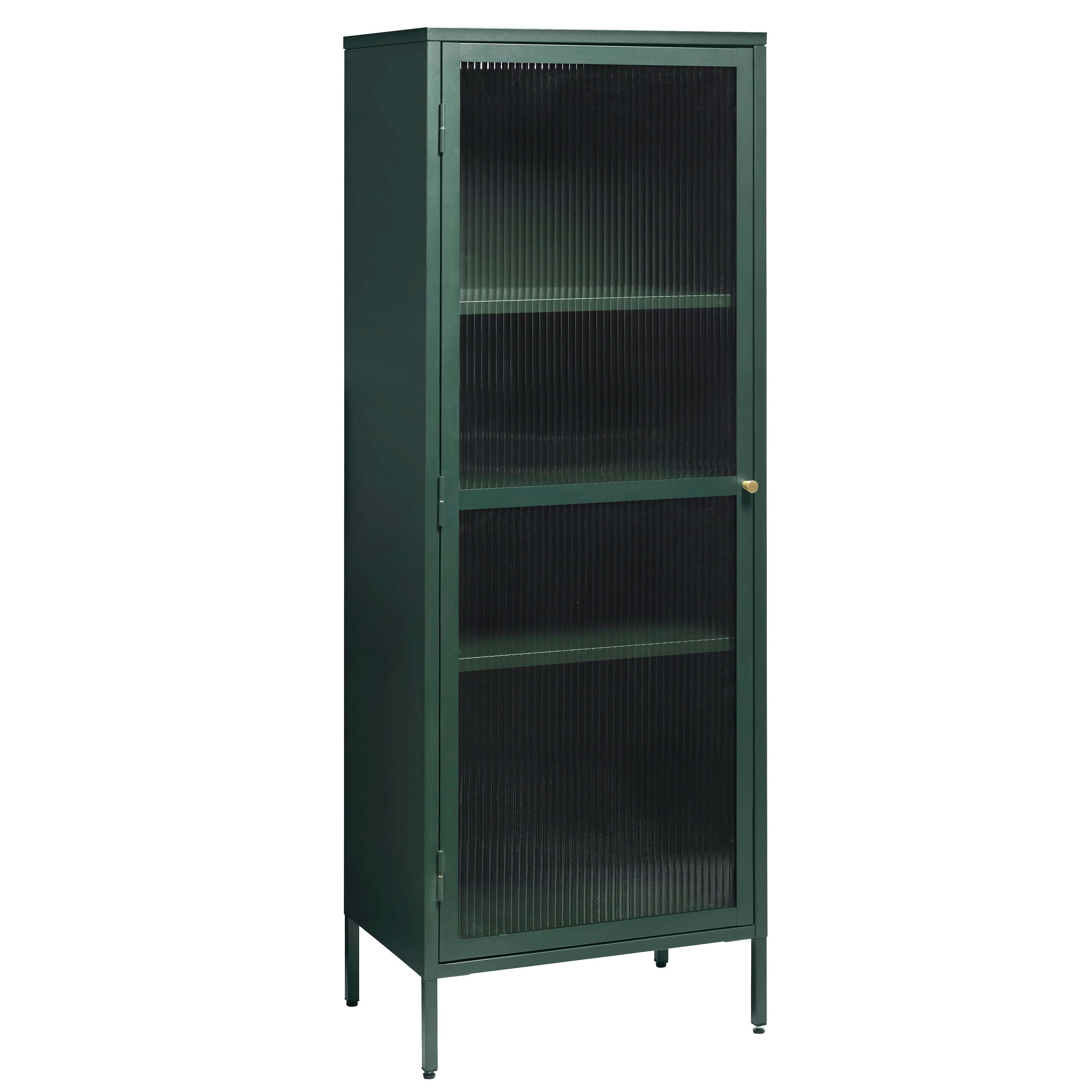Wat de Omeo Vitrinekast echt uniek maakt, is zijn uitgesproken kleur groen, wat direct de aandacht trekt en een krachtig statement maakt in elke ruimte. De kast is voorzien van een glazen deur met prachtige geribbelde glasdetails, die niet alleen een stijlvolle uitstraling geeft, maar ook zorgt voor een subtiel spel van licht en schaduw in de kast. De messing knop voegt een vleugje luxe toe aan het geheel.