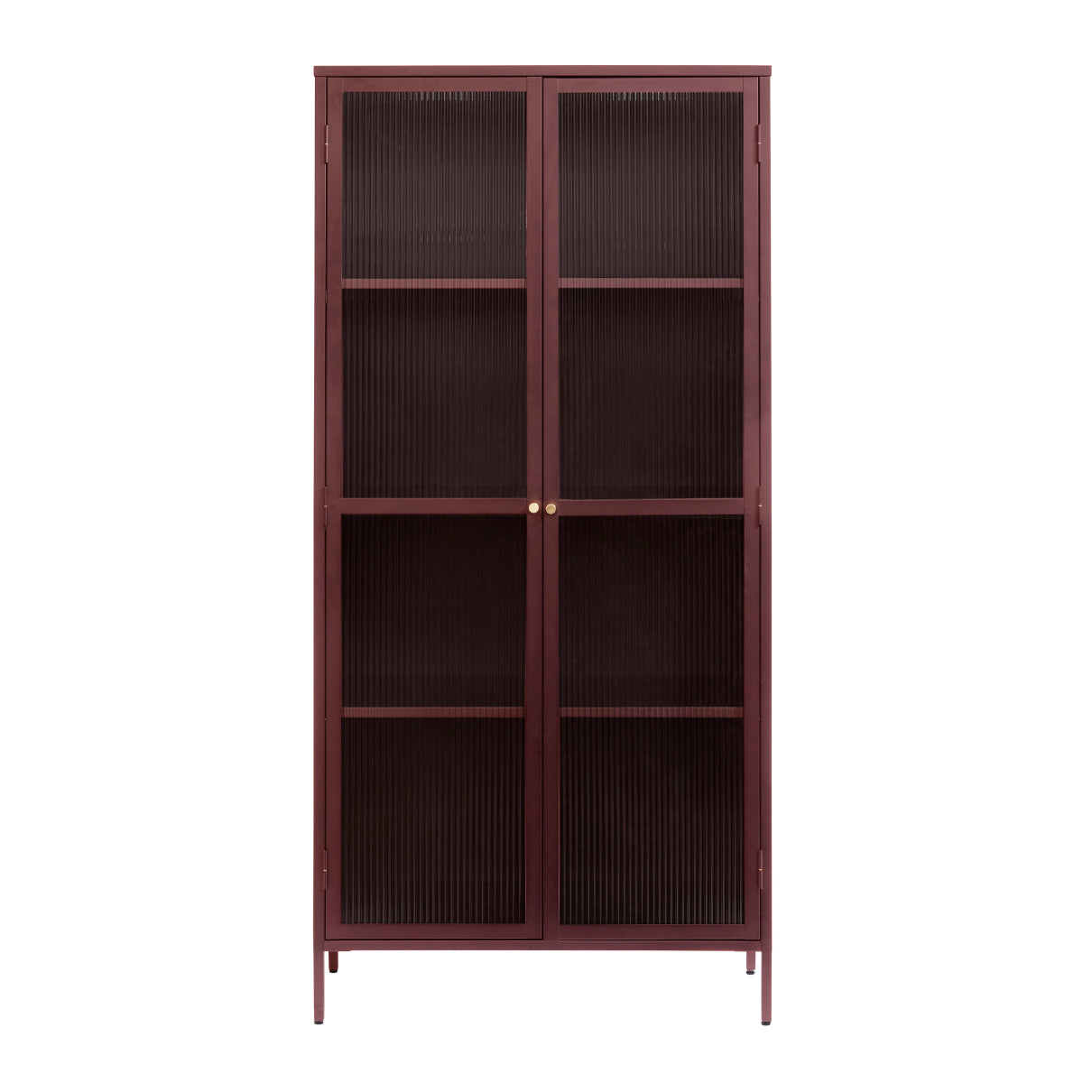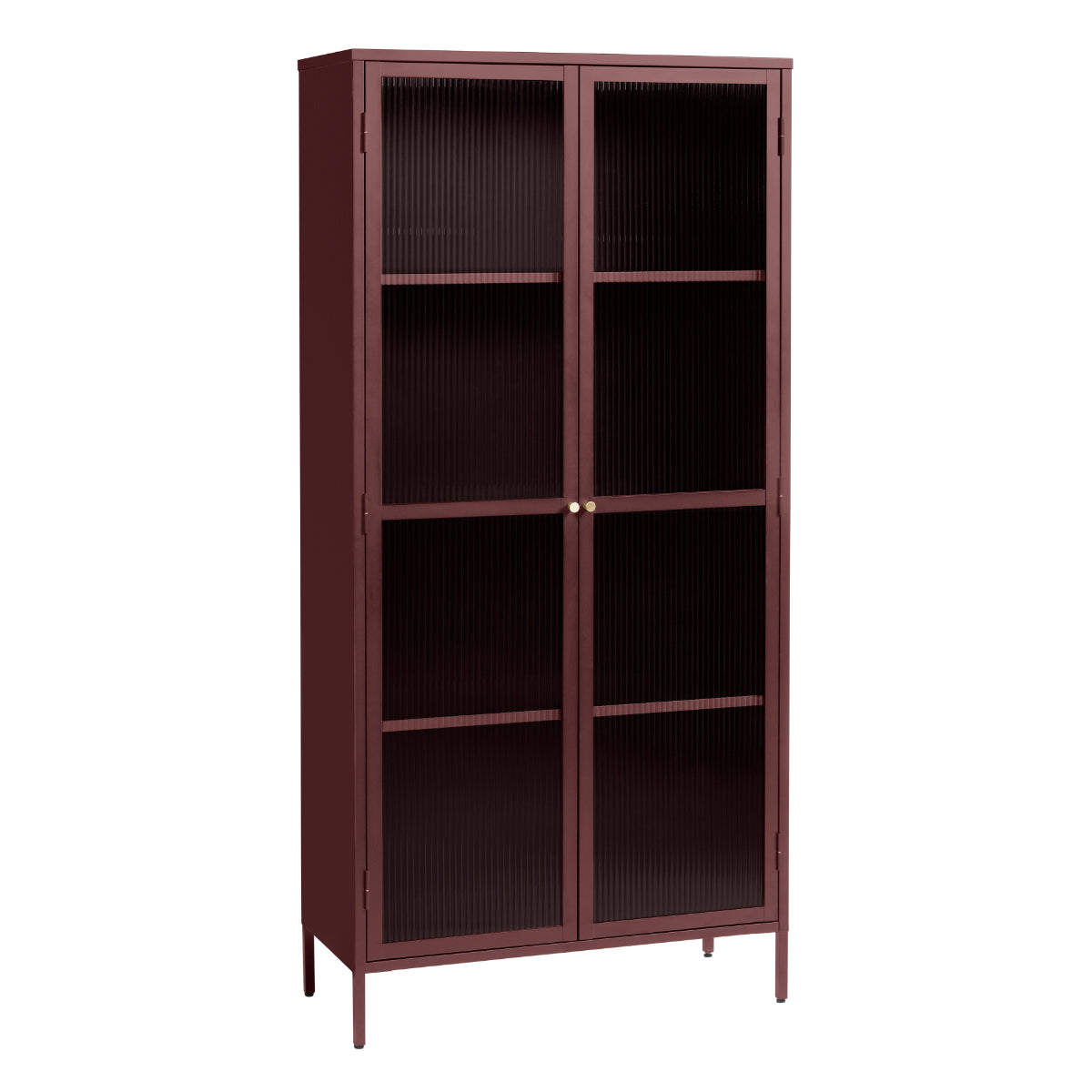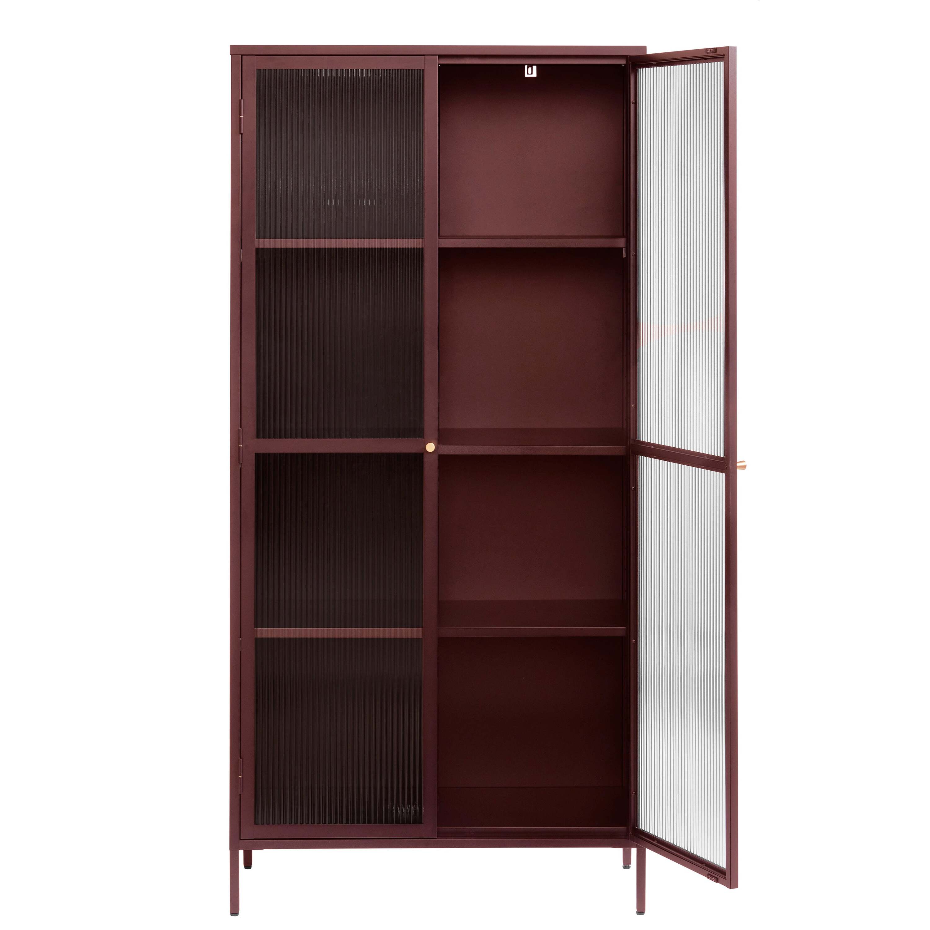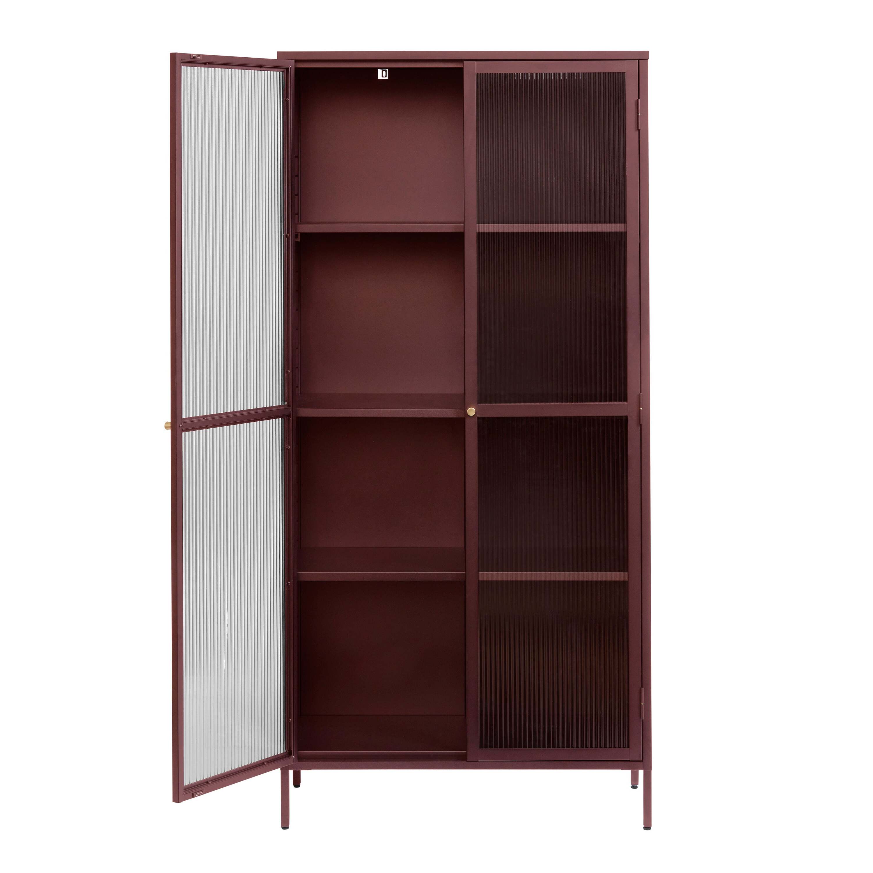 Wat de Omeo Vitrinekast echt uniek maakt, is zijn uitgesproken kleur bordeaux rood, wat direct de aandacht trekt en een krachtig statement maakt in elke ruimte. De kast is voorzien van twee glazen deuren met prachtige geribbelde glasdetails, die niet alleen een stijlvolle uitstraling geven, maar ook zorgen voor een subtiel spel van licht en schaduw in de kast. De messing knop voegt een vleugje luxe toe aan het geheel.