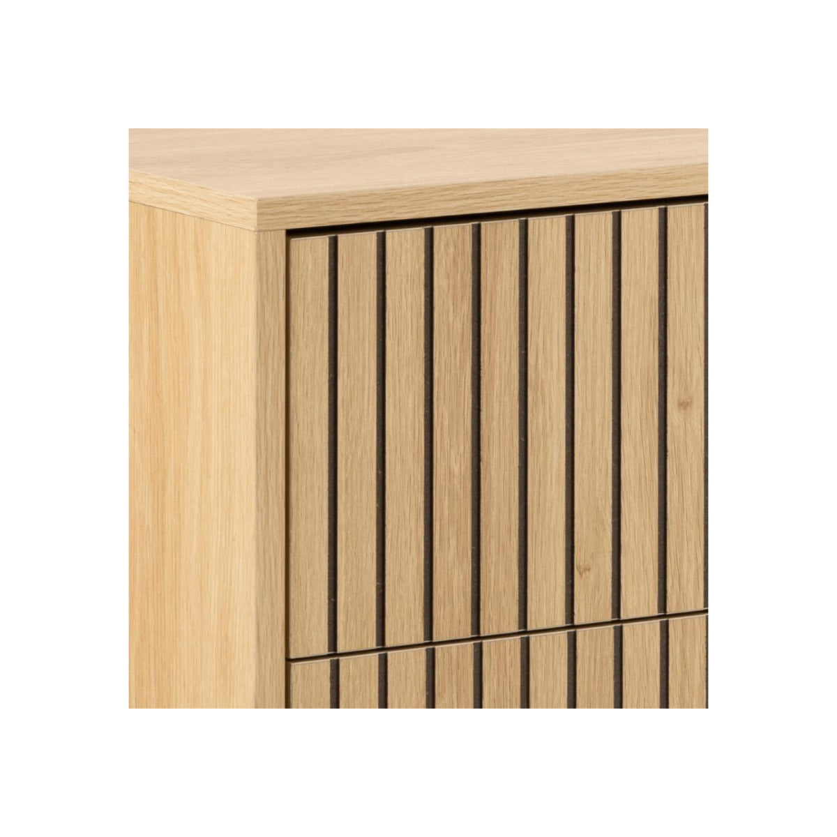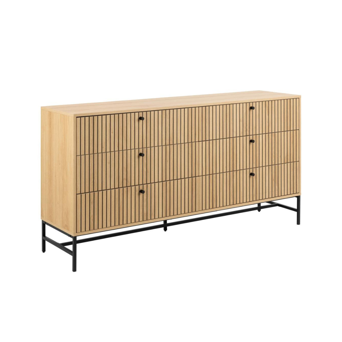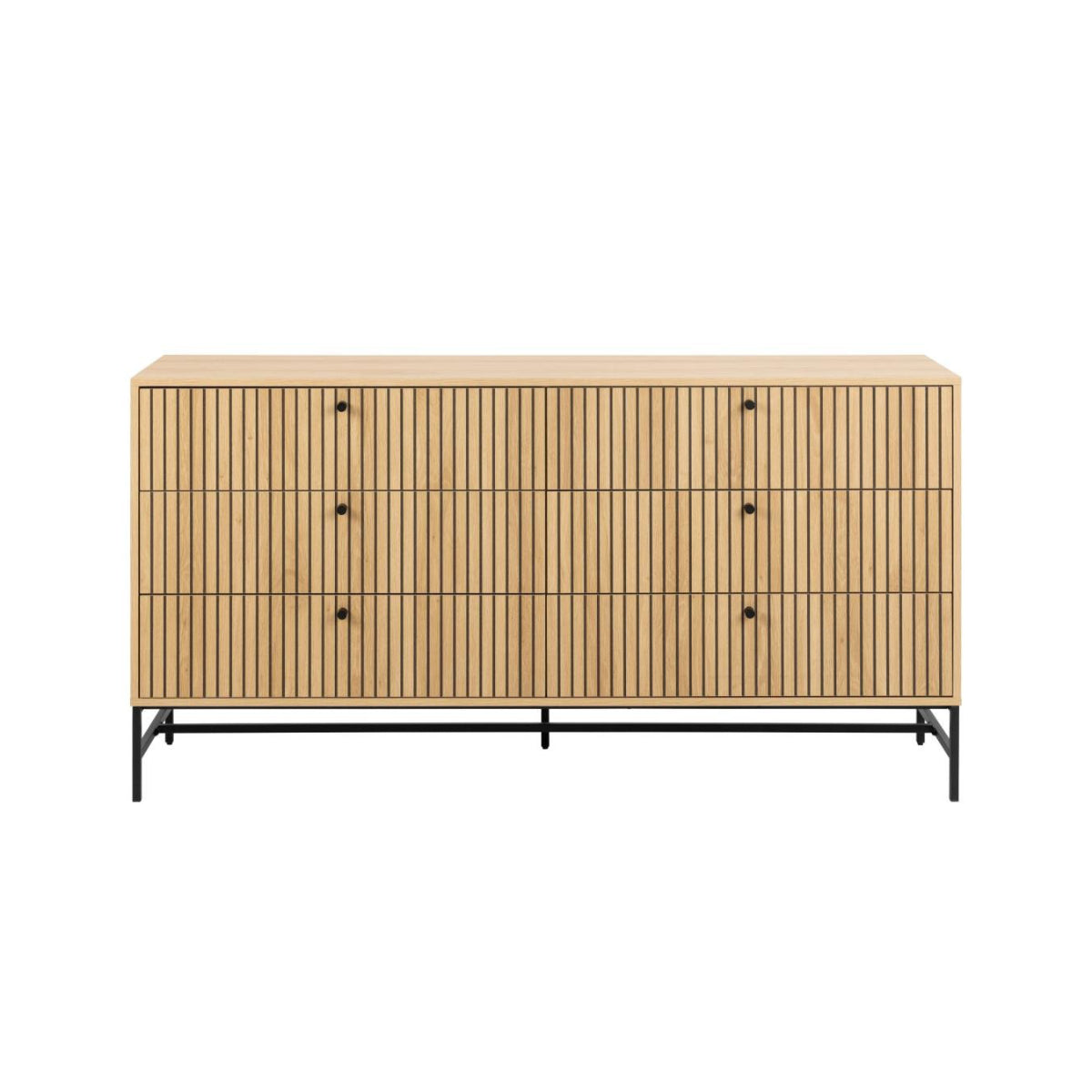 Geef je ruimte een stijlvolle boost met de Risley ladekast! Deze rechthoekige kast, met een prachtig lamellenfront en een eikenlook, weet precies hoe hij de aandacht trekt. De combinatie van de warme houttinten en matte zwarte stalen accenten zorgt voor een strakke uitstraling die in elke ruimte past.