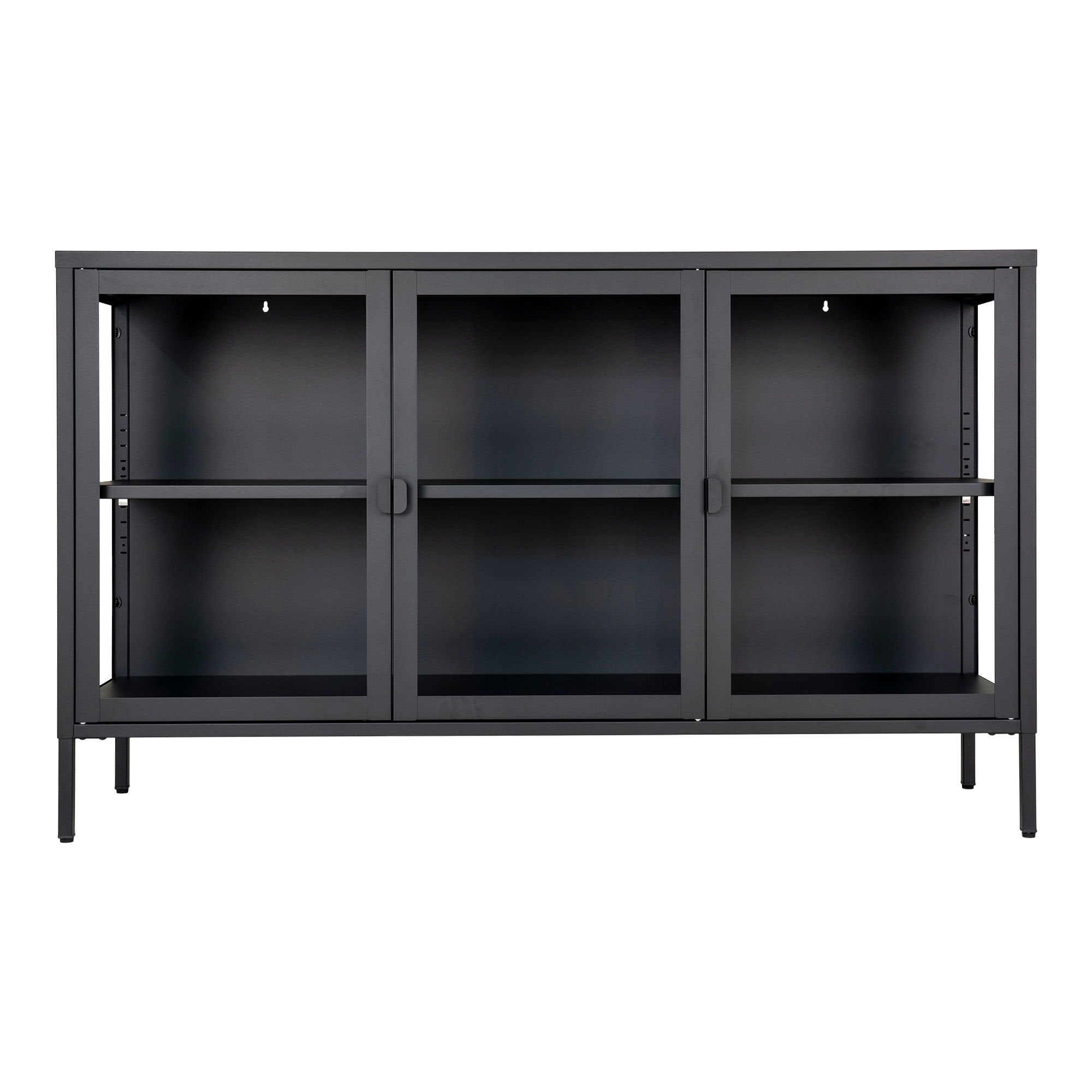 Gemaakt van stevig staal en voorzien van glazen deuren, straalt deze vitrinekast een moderne en industriële look uit. De zwarte metalen poten zorgen voor stabiliteit en geven het geheel een minimalistische uitstraling. De drie glazen deuren bieden een subtiele inkijk in de kast, waardoor je je mooiste decoraties en waardevolle voorwerpen stijlvol kunt neer zetten en kunt laten zien.