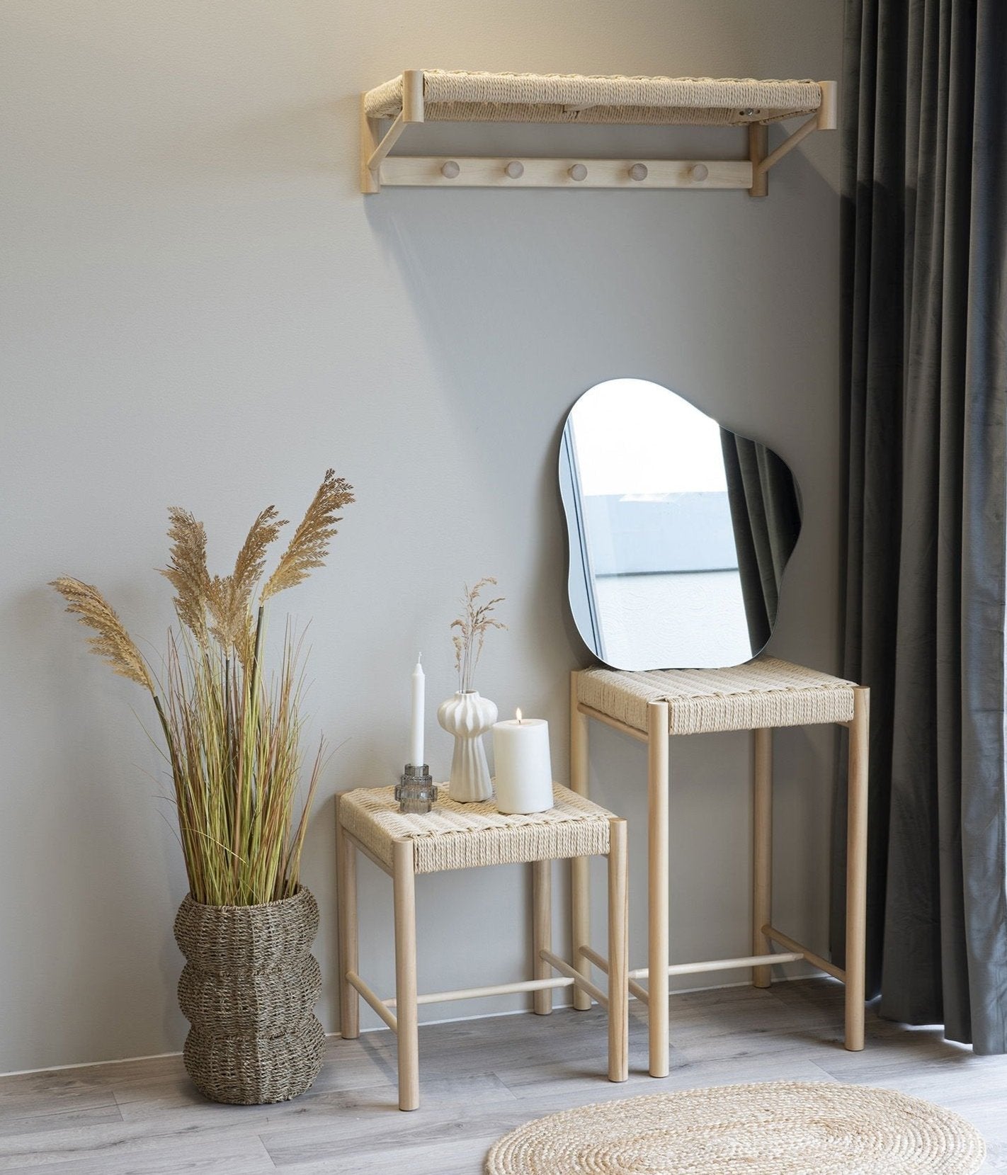 De natuurlijke uitstraling van het populierenhout en het geweven papierkoord zorgen voor een warme en uitnodigende sfeer in elke ruimte. Met een zithoogte van 66,5 cm en een diepte van 42 cm biedt de stoel comfortabel avondjes zitten aan een hoge eettafel of bar.